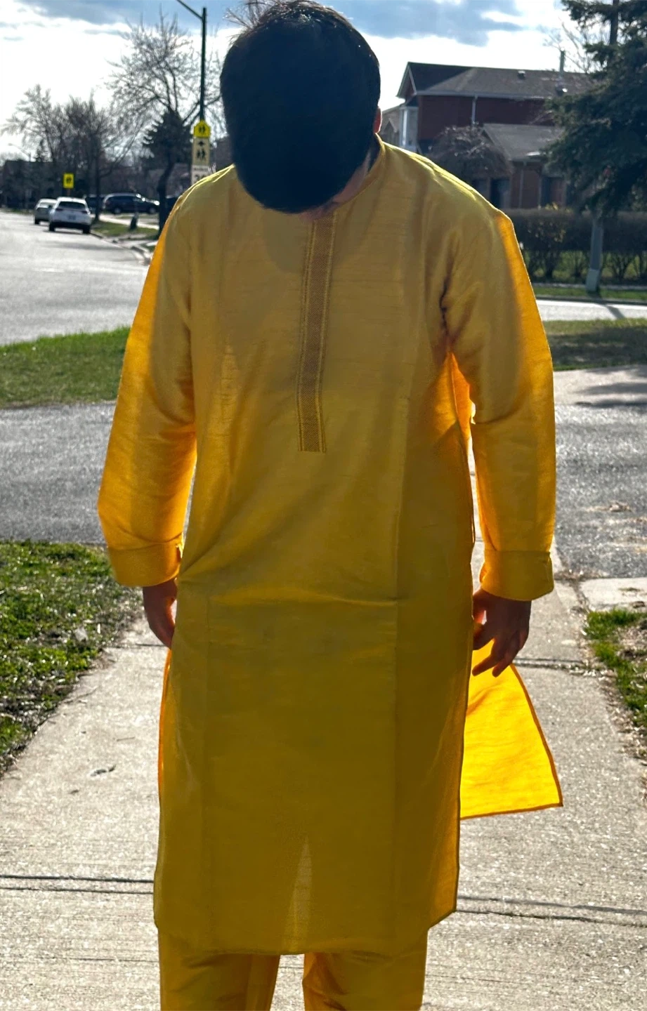 A bright yellow kurta pajama set, perfect for a festive occasion or everyday wear! The fabric looks to be in good condition. Worn only once