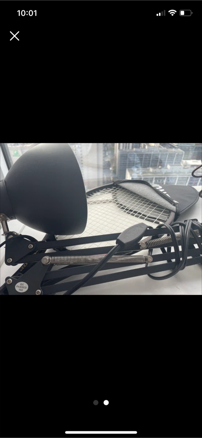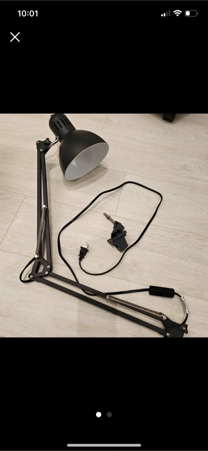 Here's an adjustable desk lamp in black! It's perfect for a desk or work area where you need some extra light. It has a flexible arm so you can adjust the angle to suit your needs