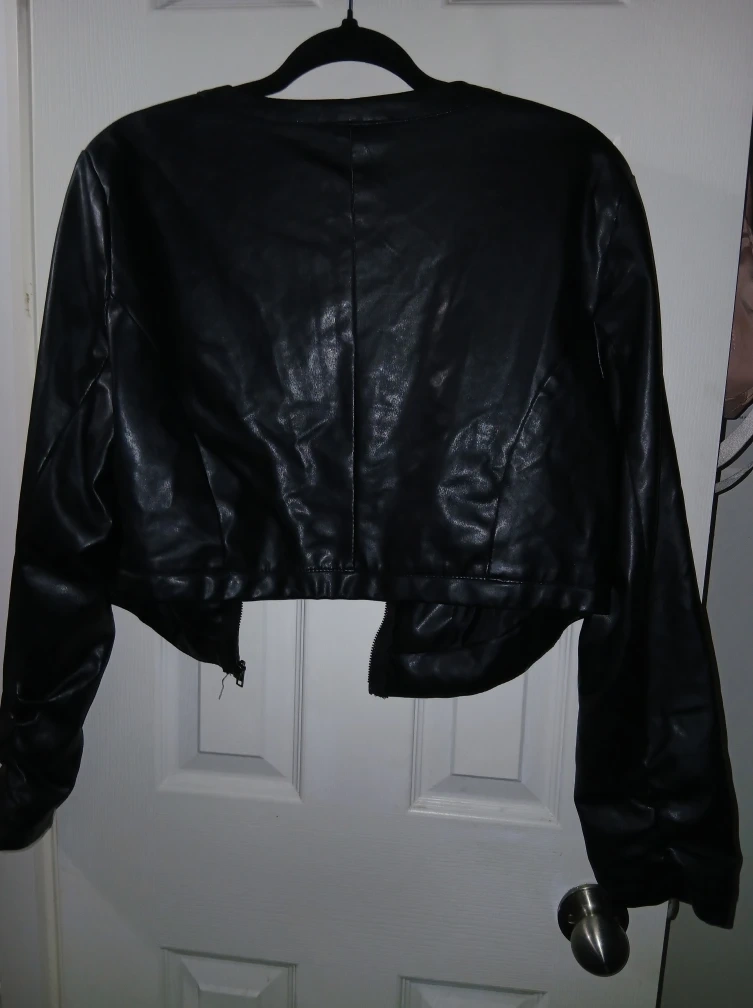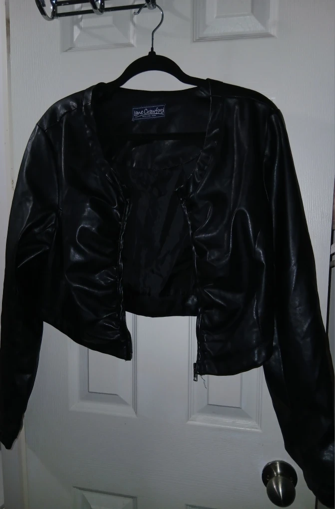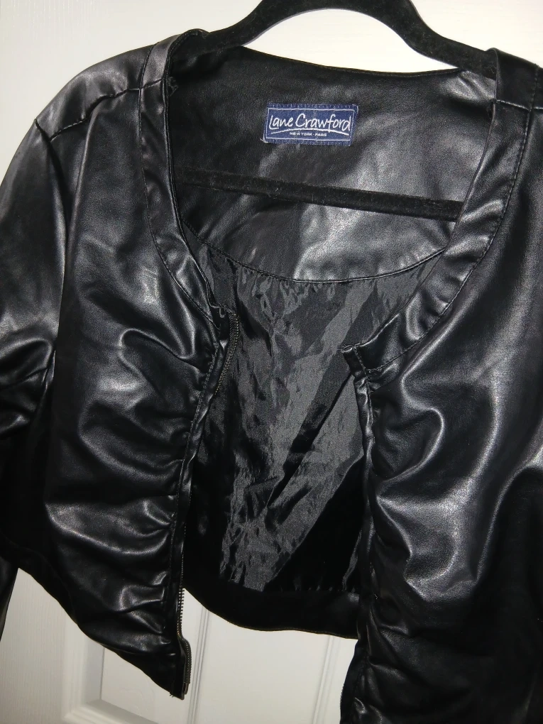 Here's a stylish Lane Crawford cropped jacket made of black faux leather! It's a great piece to add to your wardrobe for a night out or a casual day.