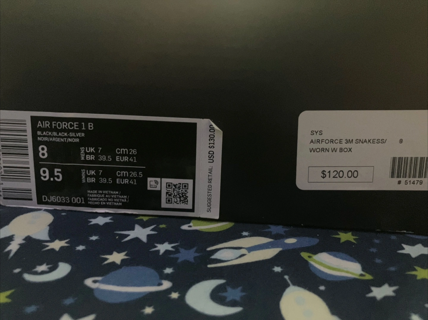 Selling a pair of Nike Air Force 1s in a sleek black and silver.Comes with the original box!