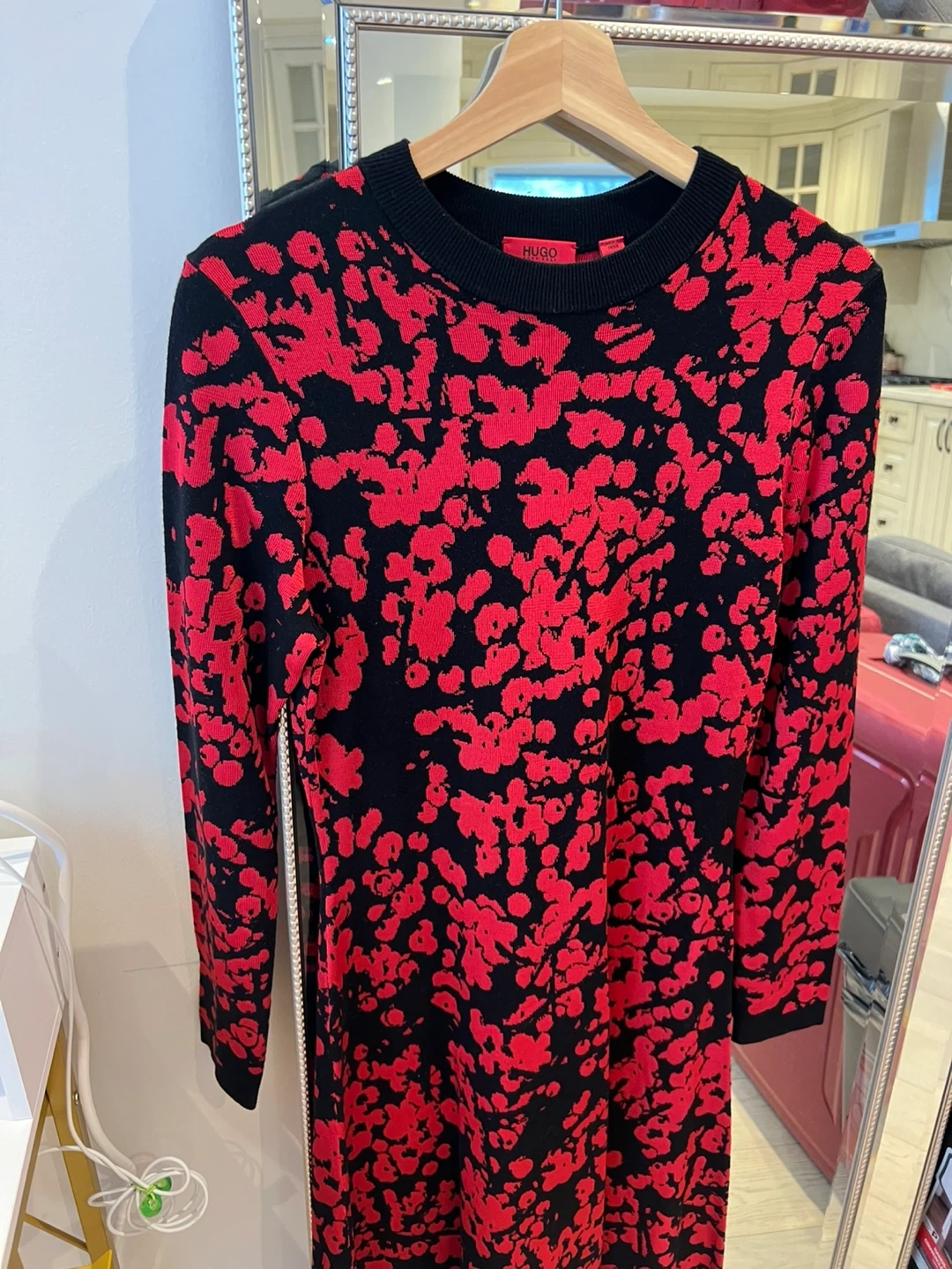 Here's a lovely Hugo Boss knit dress! It features a unique red and black pattern. It's perfect for adding a pop of colour to your wardrobe and is super comfortable to wear