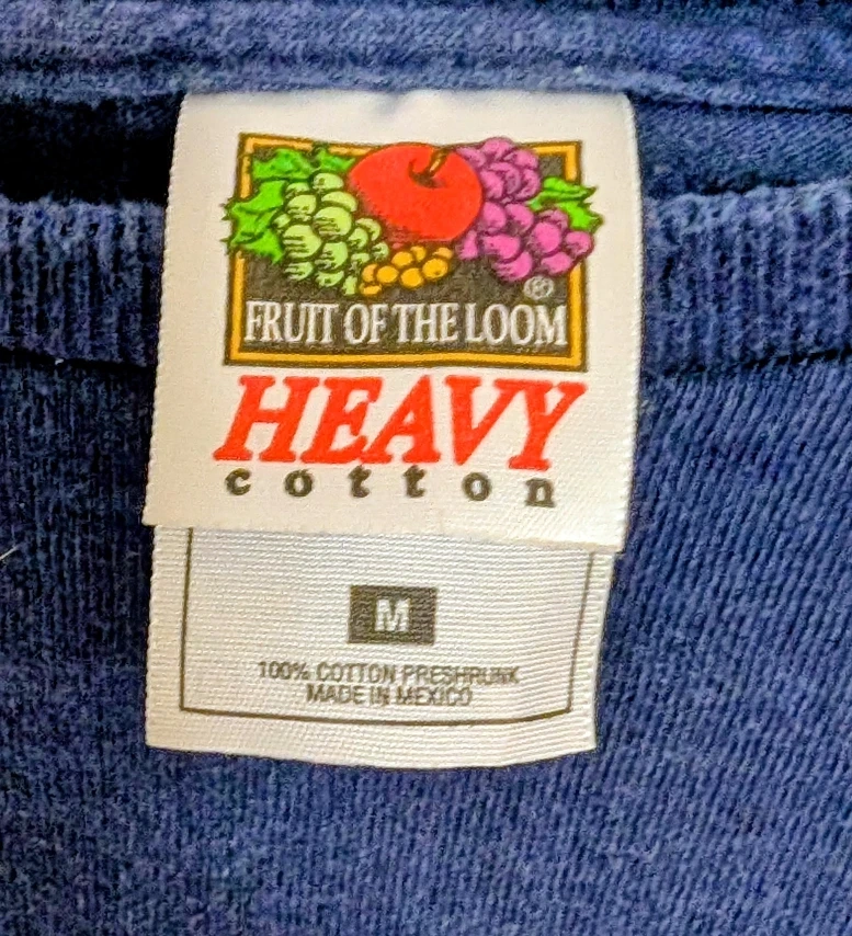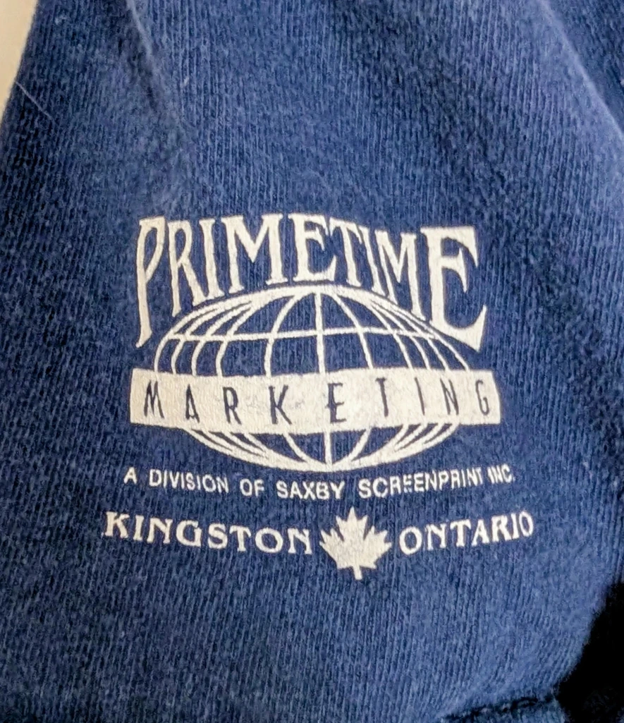 Here's a navy blue t-shirt from Fruit of the Loom! It's a size M and made of heavy cotton. The shirt has a graphic for 'Frontenac, Lennox & Addington Science Fair' on the front. Also features 'PRIMETIME MARKETING A DIVISION OF SAXBY SCREENPRINT INC. KINGSTON ONTARIO'