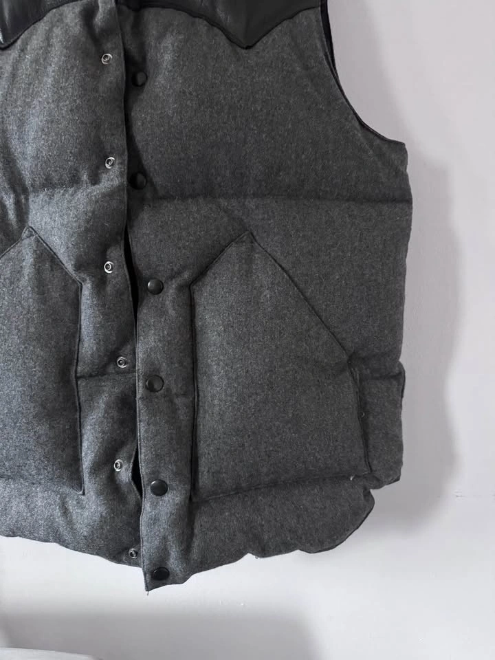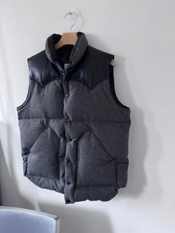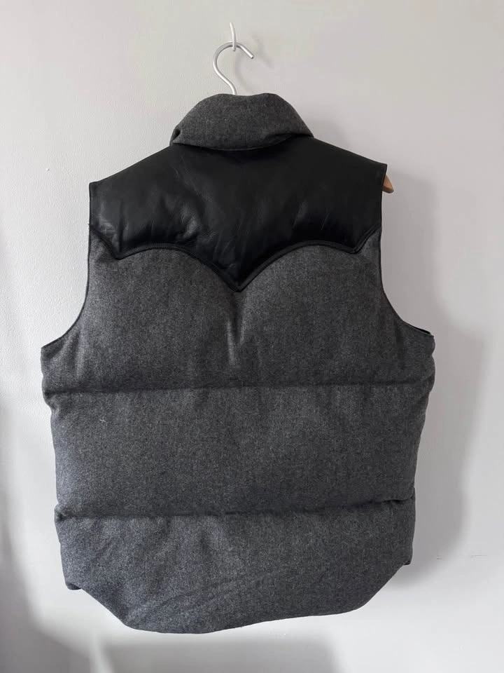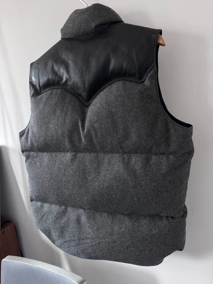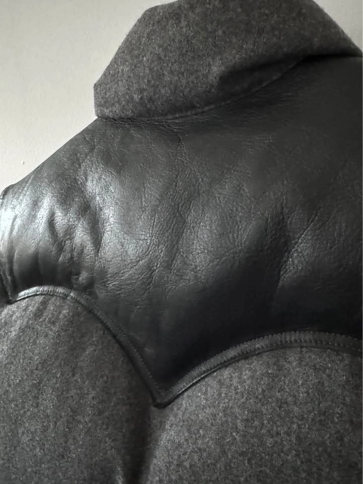 Very good condition. 100% authentic. Super warm and comfortable. Grey wool and black leather exterior. Poly interior fabric. Down filled. Made in Japan. Snap buttons. Fits between M-L US. No stains or rips. Mississauga or downtown Toronto.