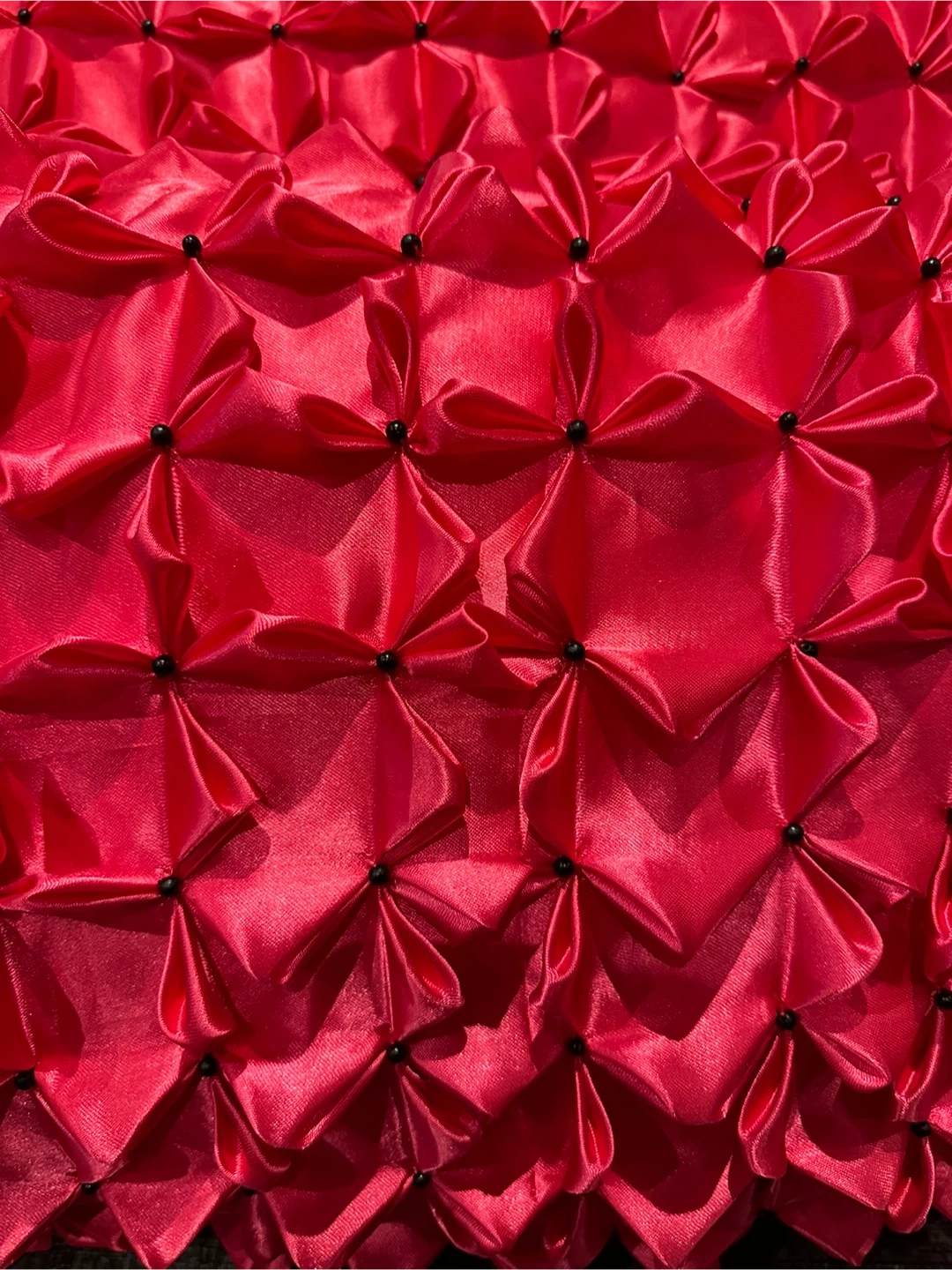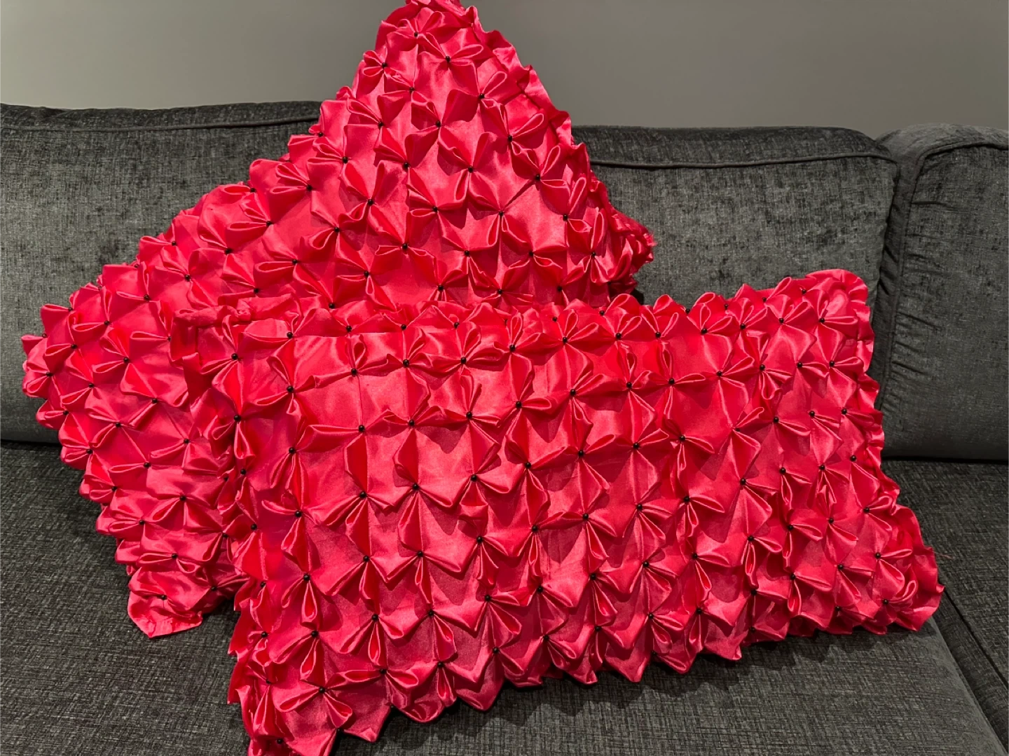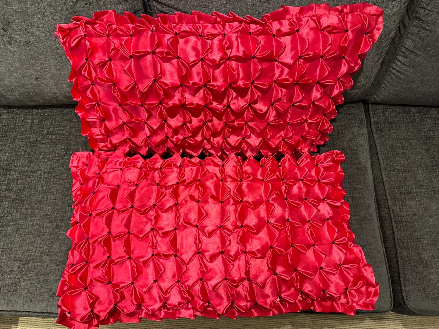 Selling a set of two hand made decorative pillows in a vibrant red colour. They have a unique textured pattern that adds a touch of elegance to any room. These pillows are in great condition and ready to brighten up your space!