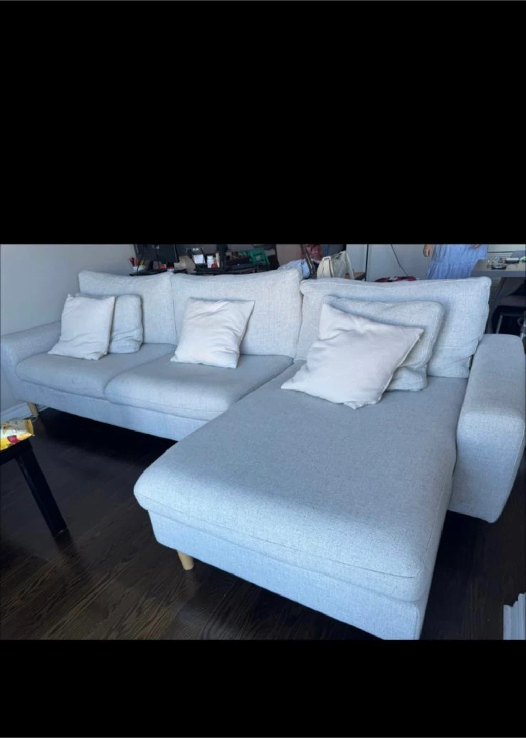 Selling a comfy light grey sectional sofa! It comes with the pillows shown in the pictures. Perfect for a living room or family room, this sofa offers plenty of seating space and a stylish look. It's in great condition and ready for a new home