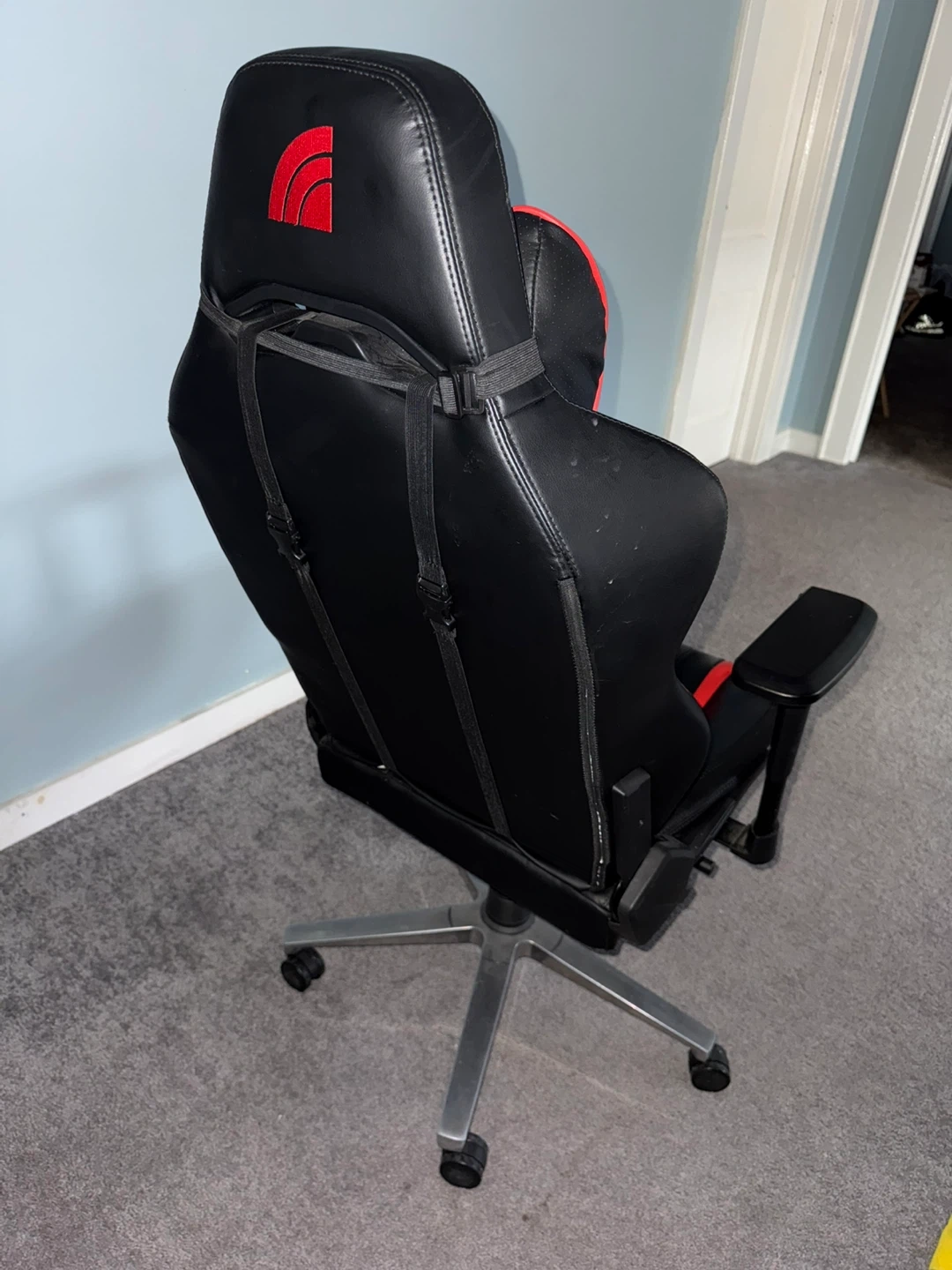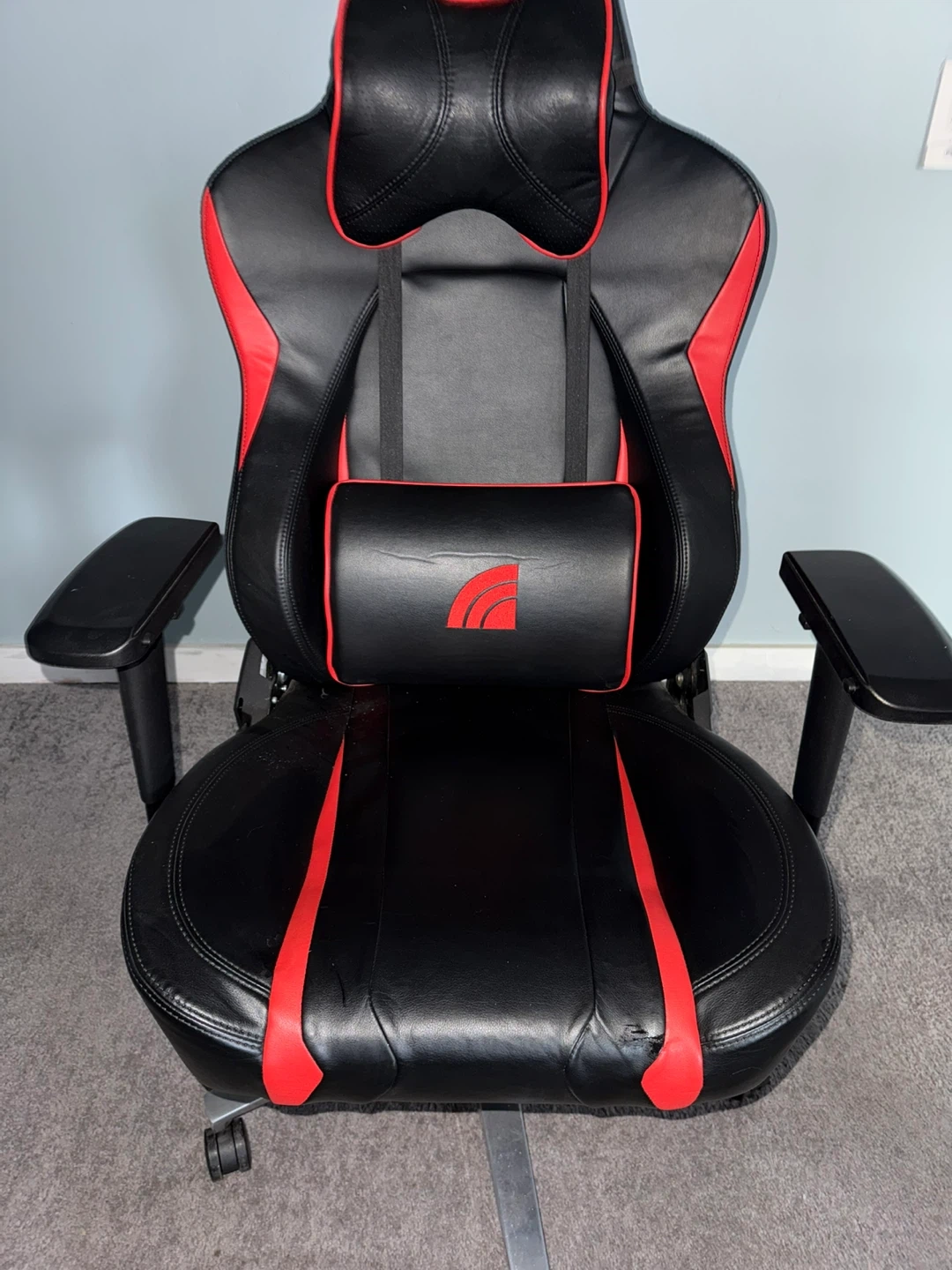 Selling a gaming chair in black with red accents! It's in good condition and ready for a new home. Perfect for long gaming sessions or working from home.