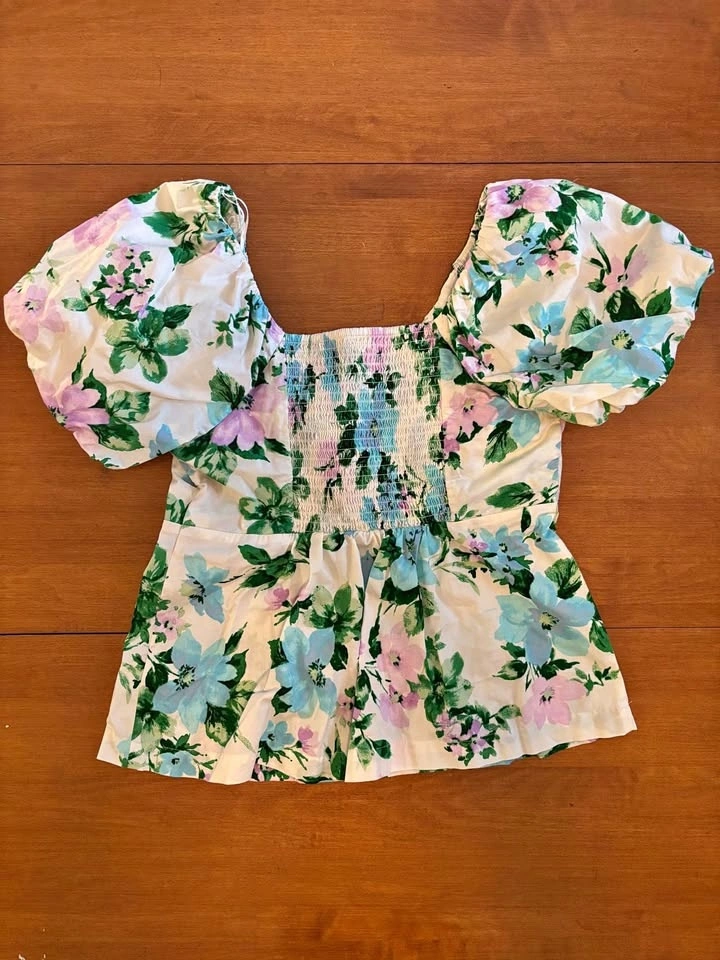 This Old Navy puff-sleeve blouse features a gorgeous floral print in soft pastels and greens. Size Medium. Like new condition (no tag), only tried on once. 100% cotton.