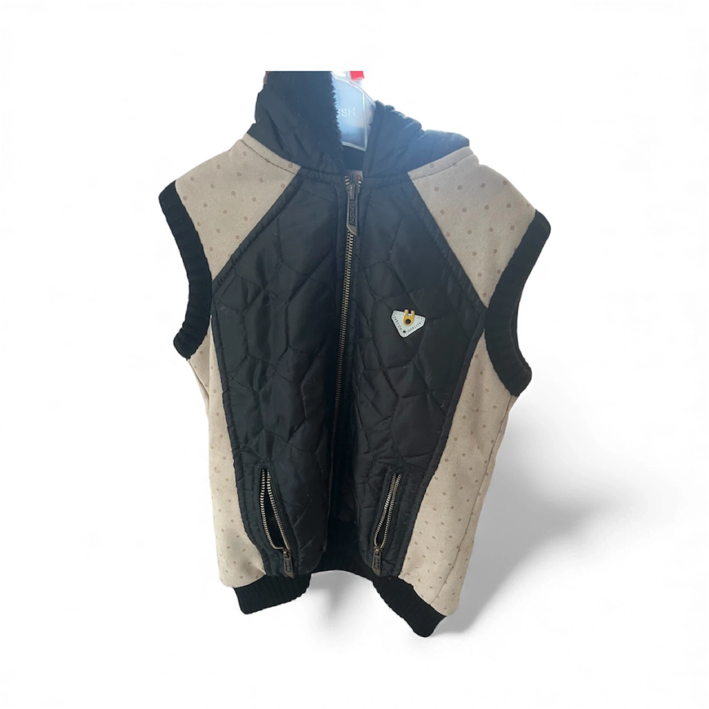 Here's a cute sleeveless padded vest for kids! It's in great condition and features a black padded front with beige polka dot sides. Perfect for layering during cooler weather! Size 6