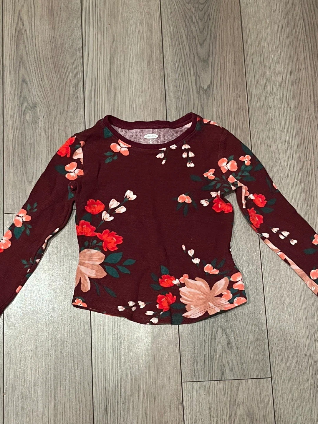 Here's a cute long sleeve top from Old Navy! It's a size 5T and features a lovely floral pattern on a burgundy background. Great for layering or wearing on its own!