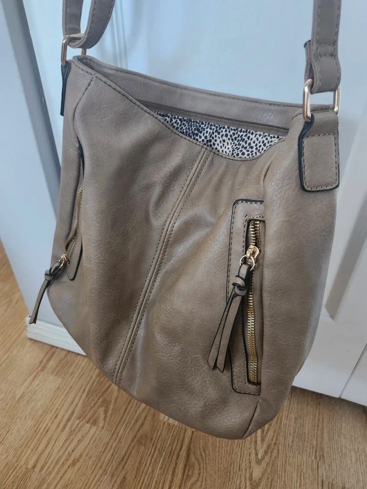 This is a lovely taupe adjustable strap hand bag. It's in like new condition and features a fun animal print lining. Perfect for everyday use!