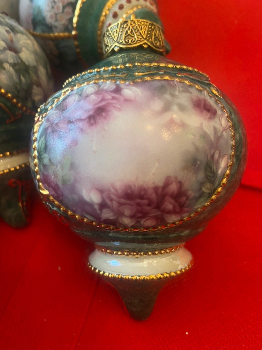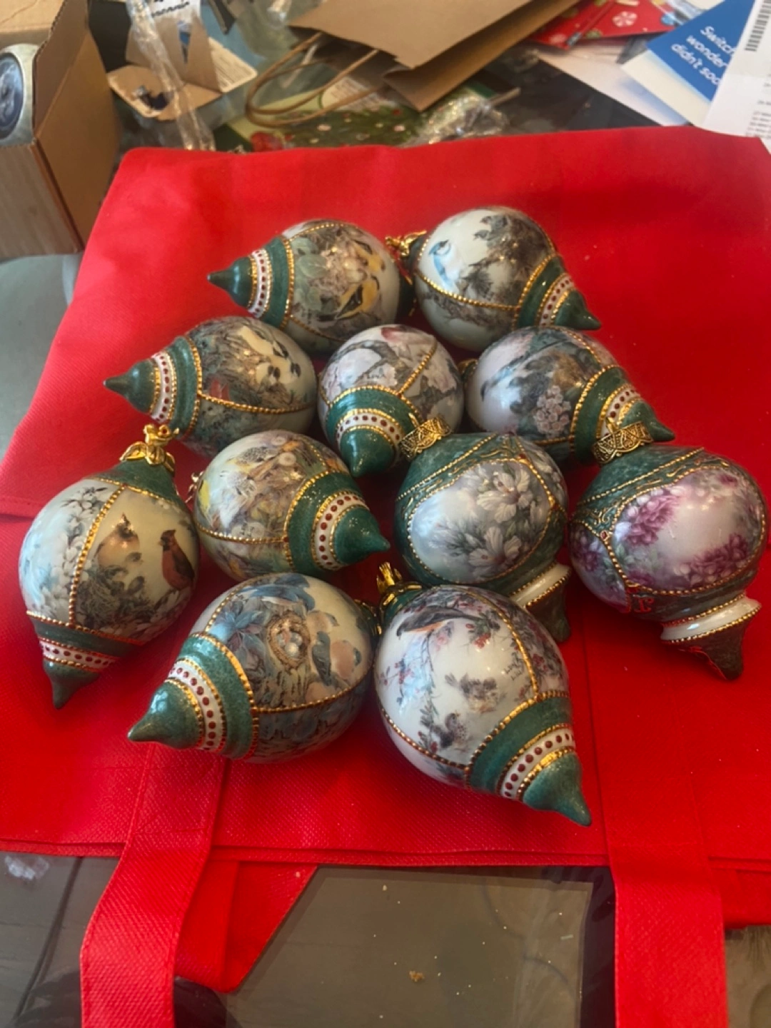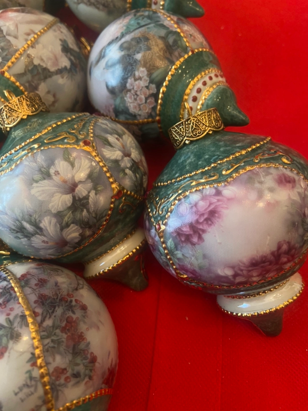 Selling a set of 11 vintage Lena Liu Christmas ornaments. They feature beautiful designs with birds and floral patterns, accented with green and gold detailing. Perfect for adding a touch of elegance to your holiday decor!