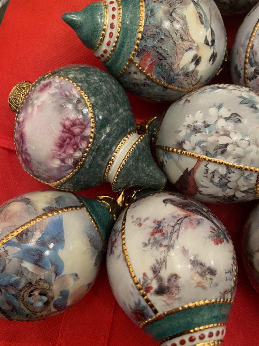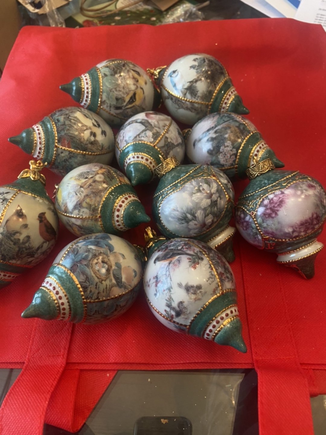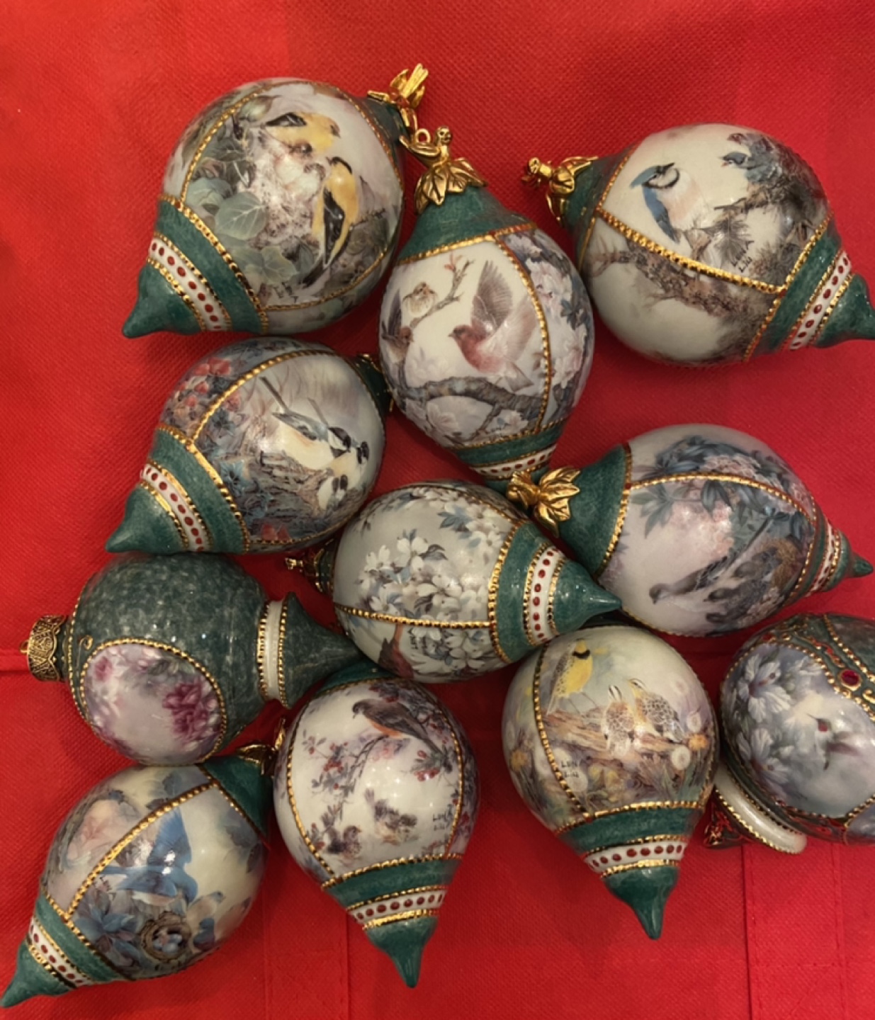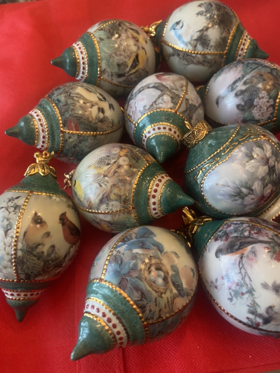 Selling a set of 11 vintage Lena Liu Christmas ornaments. They feature beautiful designs with birds and floral patterns, accented with green and gold detailing. Perfect for adding a touch of elegance to your holiday decor!
