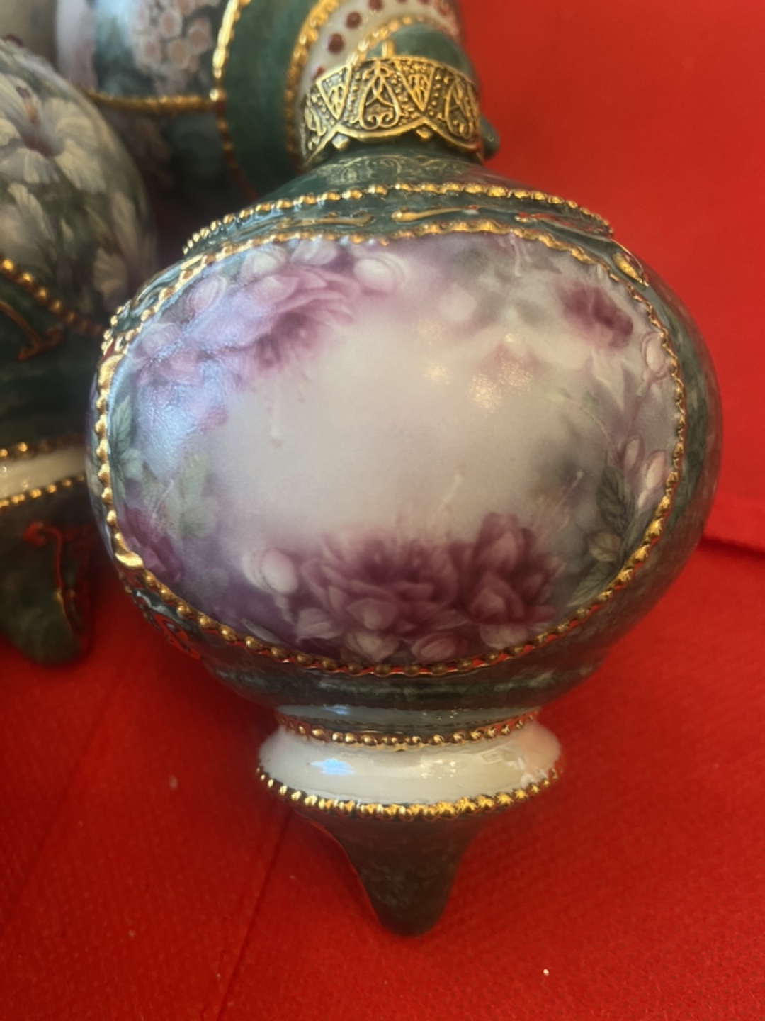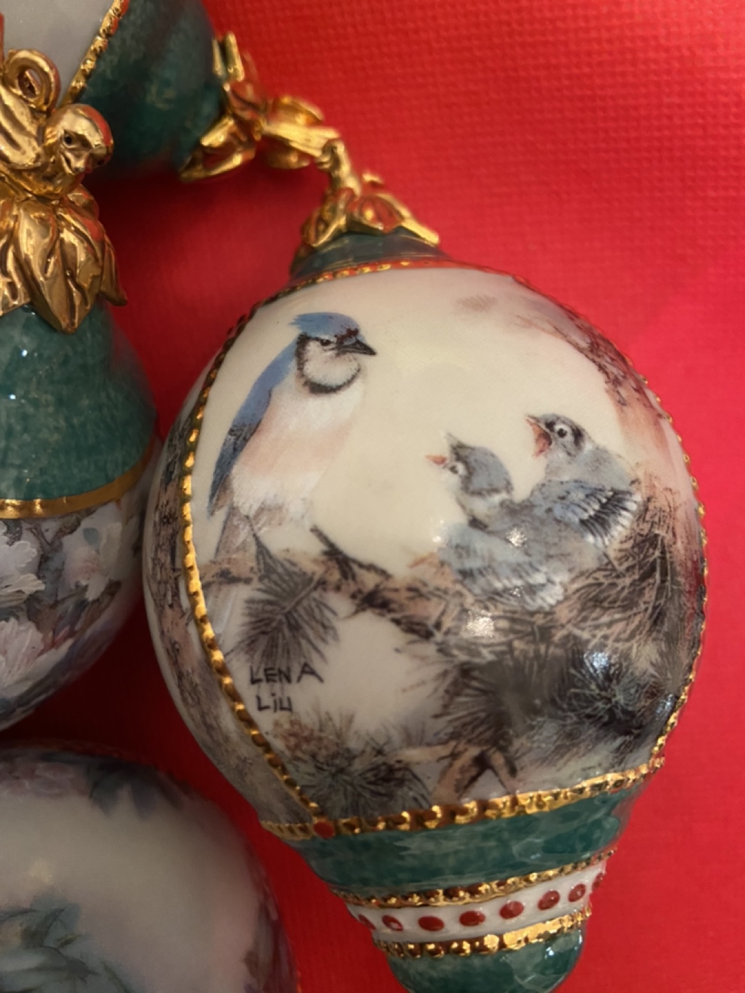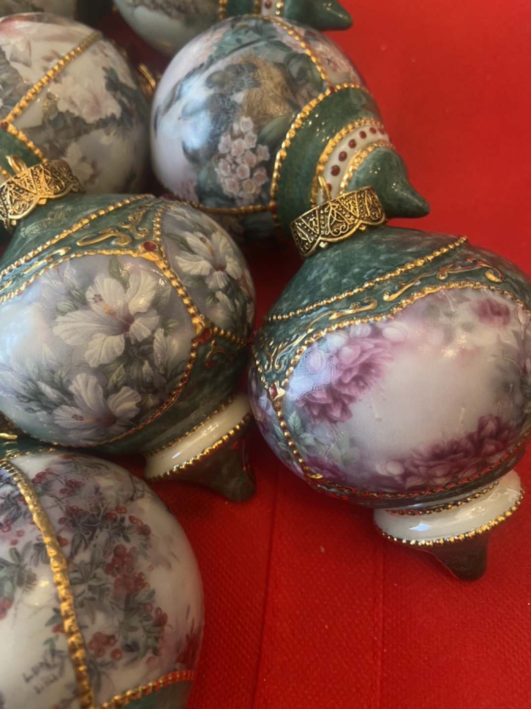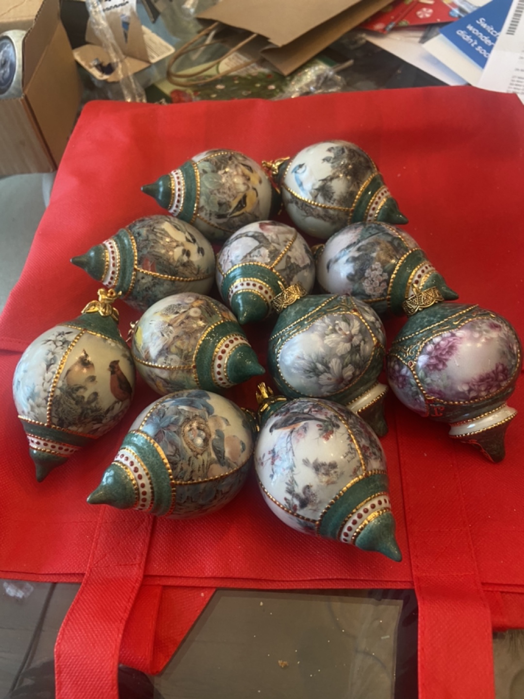 Selling a set of 11 vintage Lena Liu Christmas ornaments. They feature beautiful designs with birds and floral patterns, accented with green and gold detailing. Perfect for adding a touch of elegance to your holiday decor!