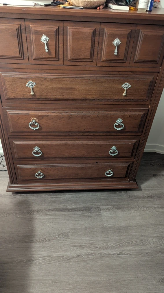 Here's a lovely brown wooden dresser! It has 5 drawers, perfect for storing your clothes and keeping your space organized. The dresser has a classic design.