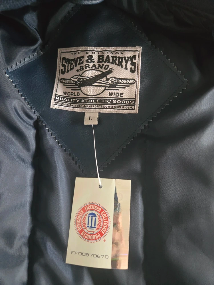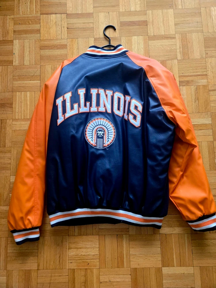 Selling a Steve & Barry's Illinois varsity jacket in size L new condition. The jacket features a navy body with orange sleeves and the Illinois logo. It's in great condition and ready for a new owner!