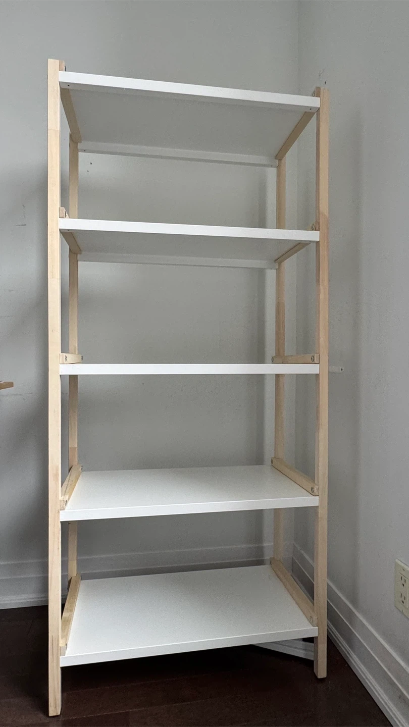 Selling an Ikea shelf unit. It's in great shape and ready to organize your space! The shelves are white, and the frame is a light wood colour. Perfect for books, plants, or anything you want to display.