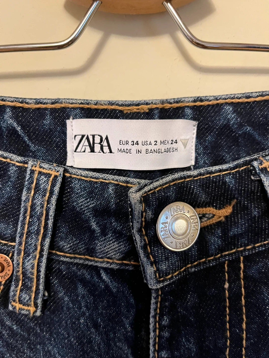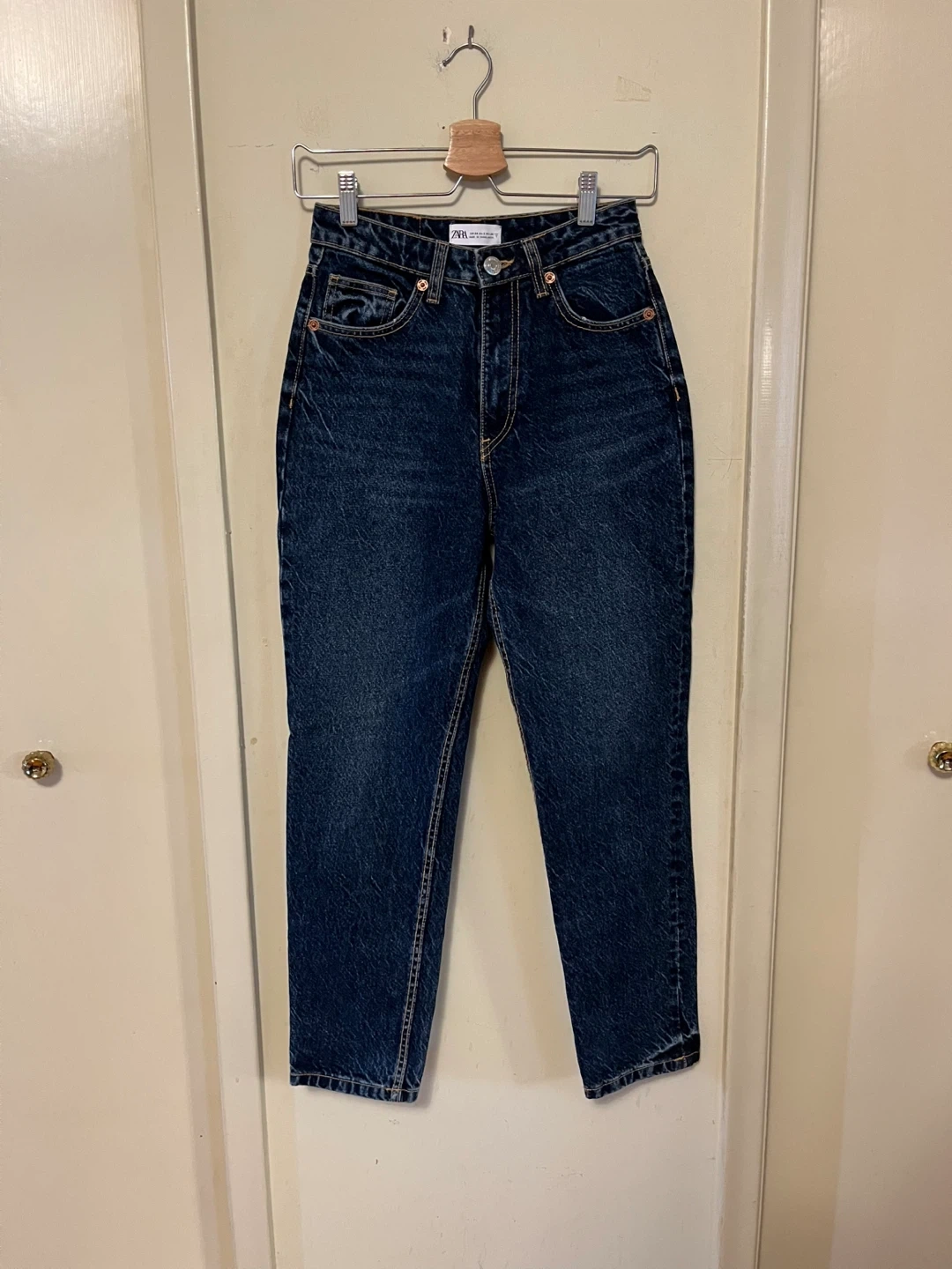 Selling a pair of Zara Mom Fit jeans in a dark blue wash. They're in great condition and are a size USA 2 / EUR 34. Perfect for a casual, everyday look!