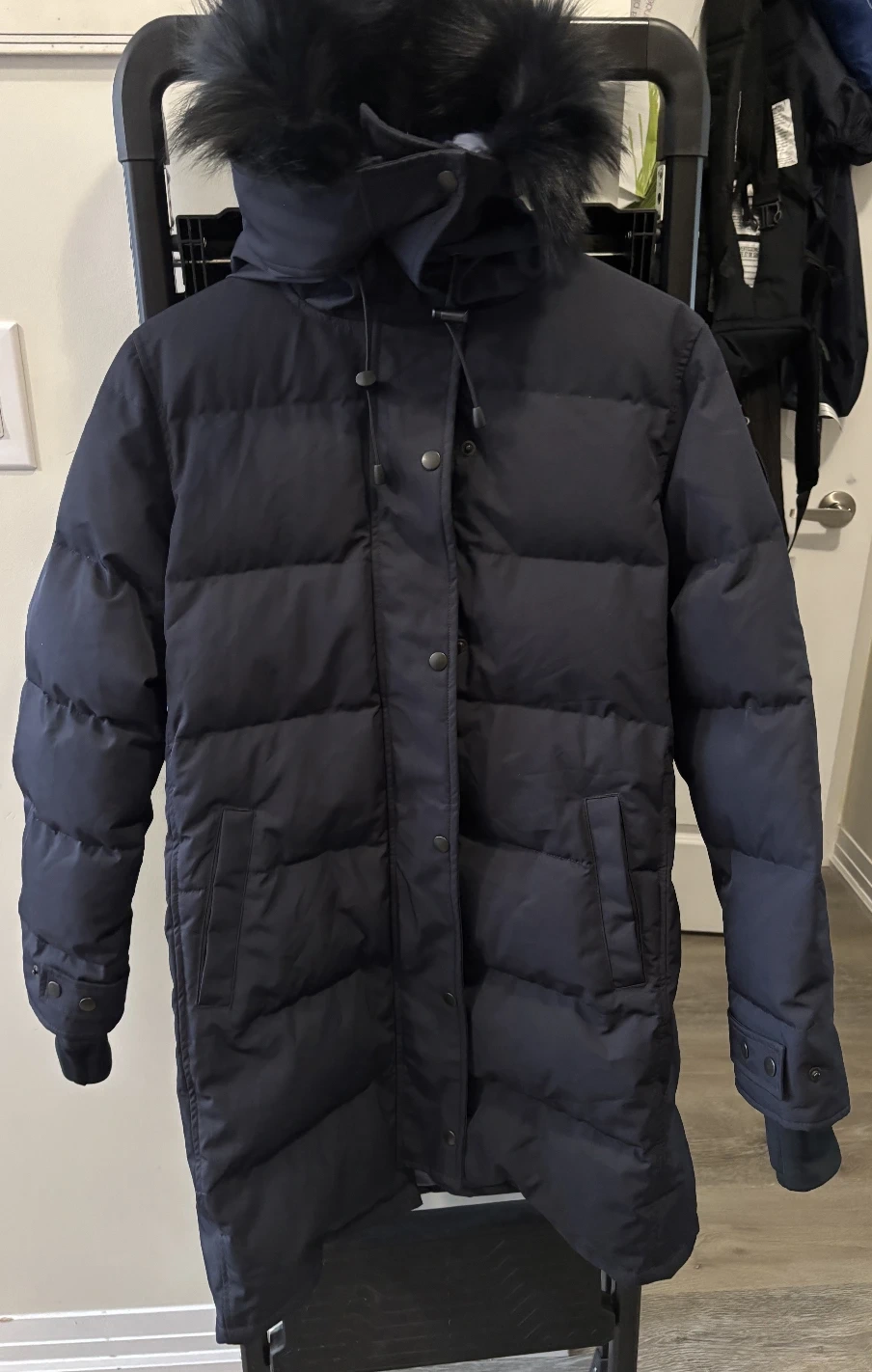 Canada Goose Montrose Parka Jacket. Size M. Navy Blue with Black Fur Hood. Black Label. Expensive coat when purchased spent approx $1200+ with taxes.
