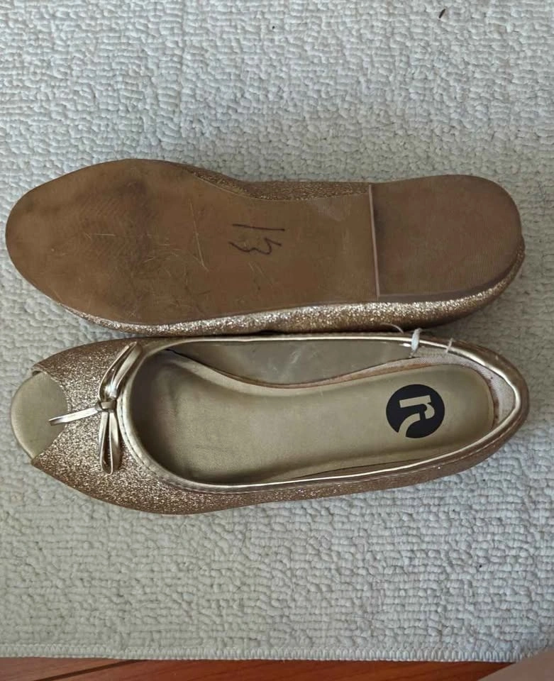 Never been worn but the bottom is marked due to try on. Man made gold glittery material. Pick up by Central park. Selling others, check my list.