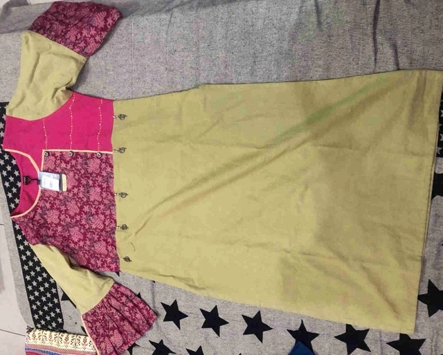 This beautiful Aroha brand kurti features a vibrant mix of pink and beige, adorned with intricate floral patterns on the yoke and sleeves. It's in excellent condition and has a stylish button-down detail, perfect for adding a touch of elegance to your wardrobe.