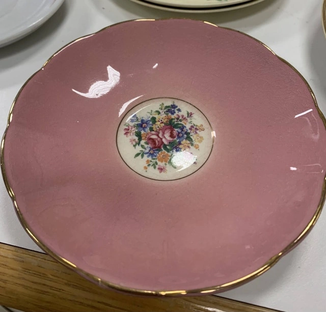 This is a used Royal Albert saucer with a pink background and floral design in the centre, showing some signs of wear and crackling. It's a charming piece for collectors or for adding a touch of vintage elegance to your tea set. * Brand: Royal Albert * Pattern: Floral * Material: Porcelain * Colour: Pink with gold trim This saucer has a beautiful floral design which will definitely add a touch of elegance to your collection. If the ad is up, it's still available!