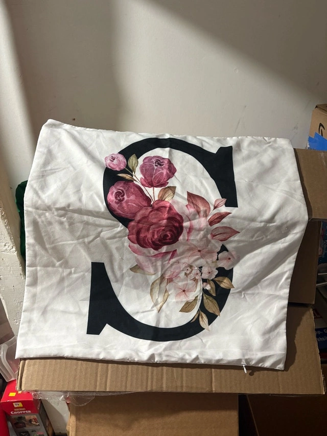 Add a personal touch to your space with this decorative floral letter S pillow! The pillow is in good, used condition, perfect for adding a pop of colour and personality to any room. It is a wonderful way to express your style. * **Design**: Features a floral design with the letter "S". * **Condition**: Good.