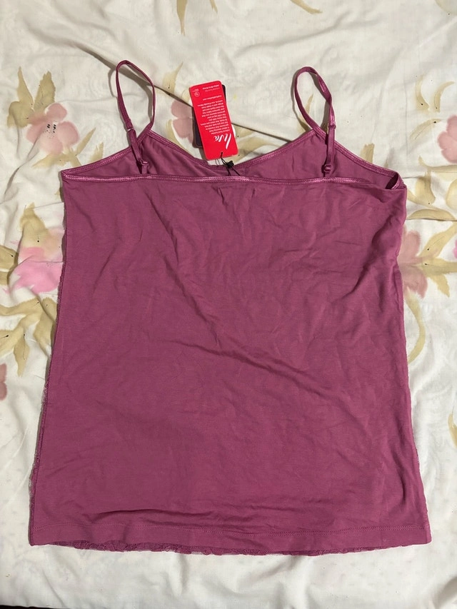This is a new Liva tank top in size 1G, perfect for layering or wearing on its own, featuring delicate lace detailing, soft and breathable fabric, and adjustable straps for a comfortable fit. Additional specifications include: * Size: 1G * Brand: Liva * Colour: Purple * Material: Eco-friendly fibres