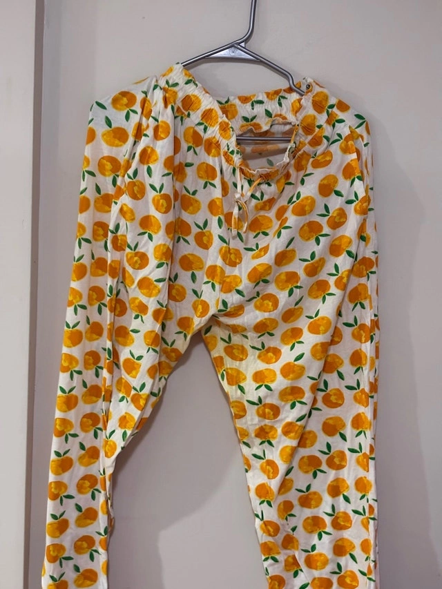 These are used peach print pants, perfect for a casual and fun look. The pants are in good condition, ready to add a pop of colour to your wardrobe. They're super comfy! If you're seeing this ad, the pants are still available.