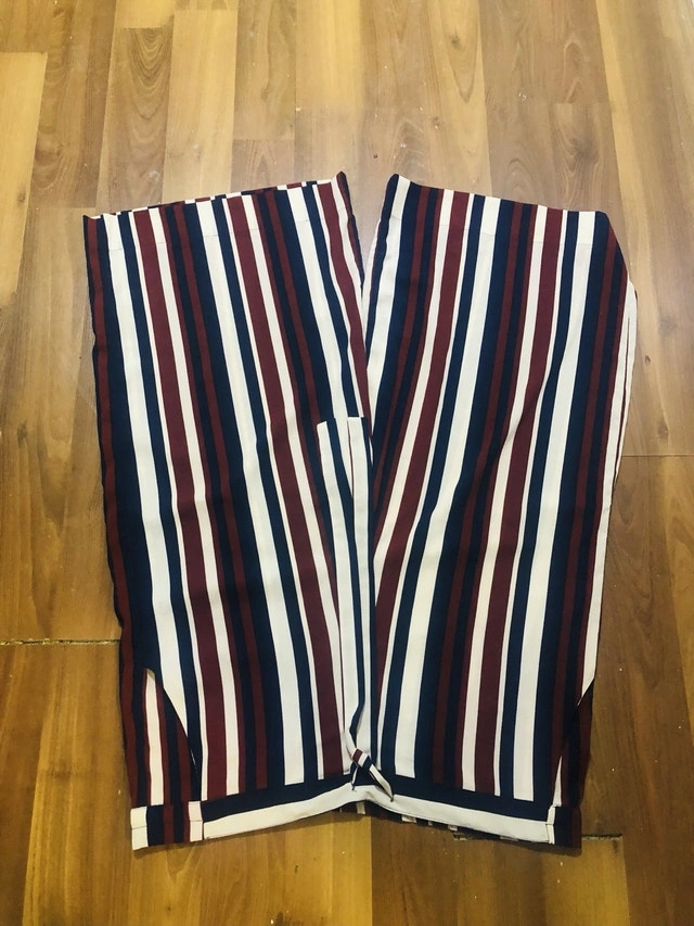 Add a pop of pattern to your wardrobe with these striped pants! These pants are in used condition, but still have a lot of life left. The vertical stripes create a flattering silhouette, and the lightweight fabric makes them perfect for warmer weather. Features: * Striped pattern * Lightweight fabric * Comfortable fit Looking to add a touch of whimsy to your day? Snatch up these trousers before they trot off to a new home! And a friendly reminder: if the ad's up, the pants are still up for grabs!