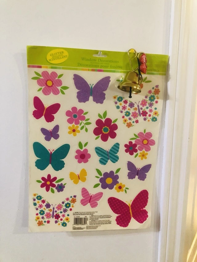 Add a touch of sparkle to your windows with these charming glitter window decorations. These delightful decals feature a variety of butterflies and flowers. These decorations are in used condition, perfect for adding a whimsical touch to any room. Here are some details: * Glitter accents for a sparkling effect * Easy to apply and remove * Suitable for smooth surfaces Looking to add a bit of magic to your space? These glittery decorations are just the thing! If the ad is up, the decorations are still available. Grab them before they flutter away! Given its condition, I'm pricing it at $3, reflecting its playful charm and accessibility.