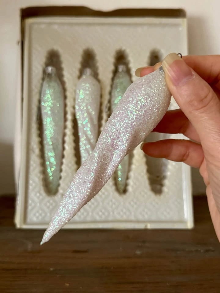 MCM 1960s/70s Vintage Commodore Glass Icicles (Made in Romania) Rare set of four Mid-Century Modern (MCM) vintage "Christmas Classics" by Commodore Manufacturing Corp. (Brooklyn, NY). These hand-decorated, twisted glass icicle ornaments were expertly crafted by European artisans in Romania in the 1960s or 1970s. Featuring sparkling white and iridescent glitter, this set is a highly sought-after collectible in the original box. Perfect for lovers of retro, farmhouse, or classic European holiday decor. Excellent vintage condition. Porch pick up Christie St and St. Clair West Ave (10 min walk from St. Clair WEST Subway station). Cash only