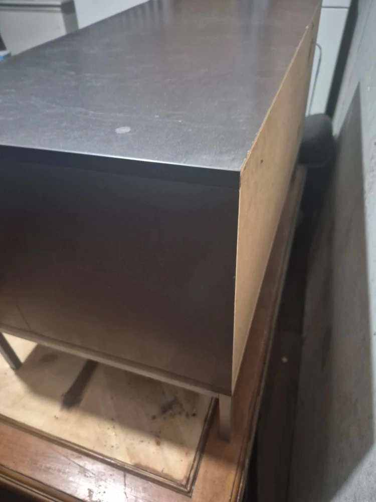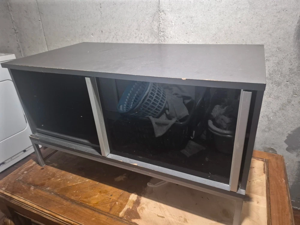 Selling a grey cabinet with sliding doors. It has a simple design and could be used for storage or as a TV stand. Good condition!