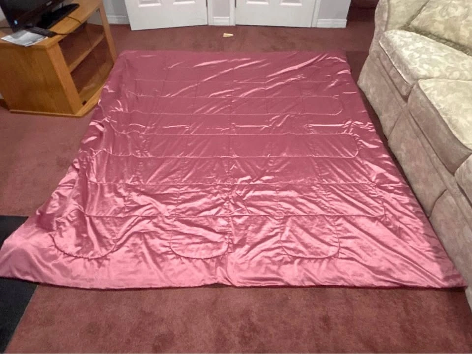 I am selling a comforter with two shams. One side is light pink, and the other side is dark pink. It fits for a small queen size or a large double. The comforter does have some signs of a bit of wear, but it is clean, and in good condition.
