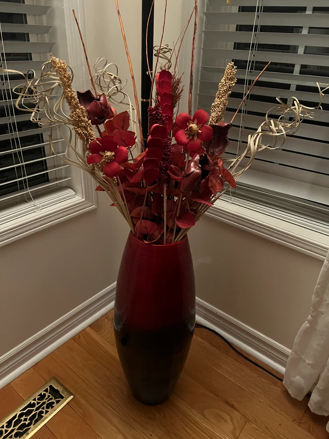 Selling a decorative vase with a red and brown gradient. It comes with a floral arrangement featuring red flowers and decorative beige accents. This piece would add a touch of sophistication to any room!