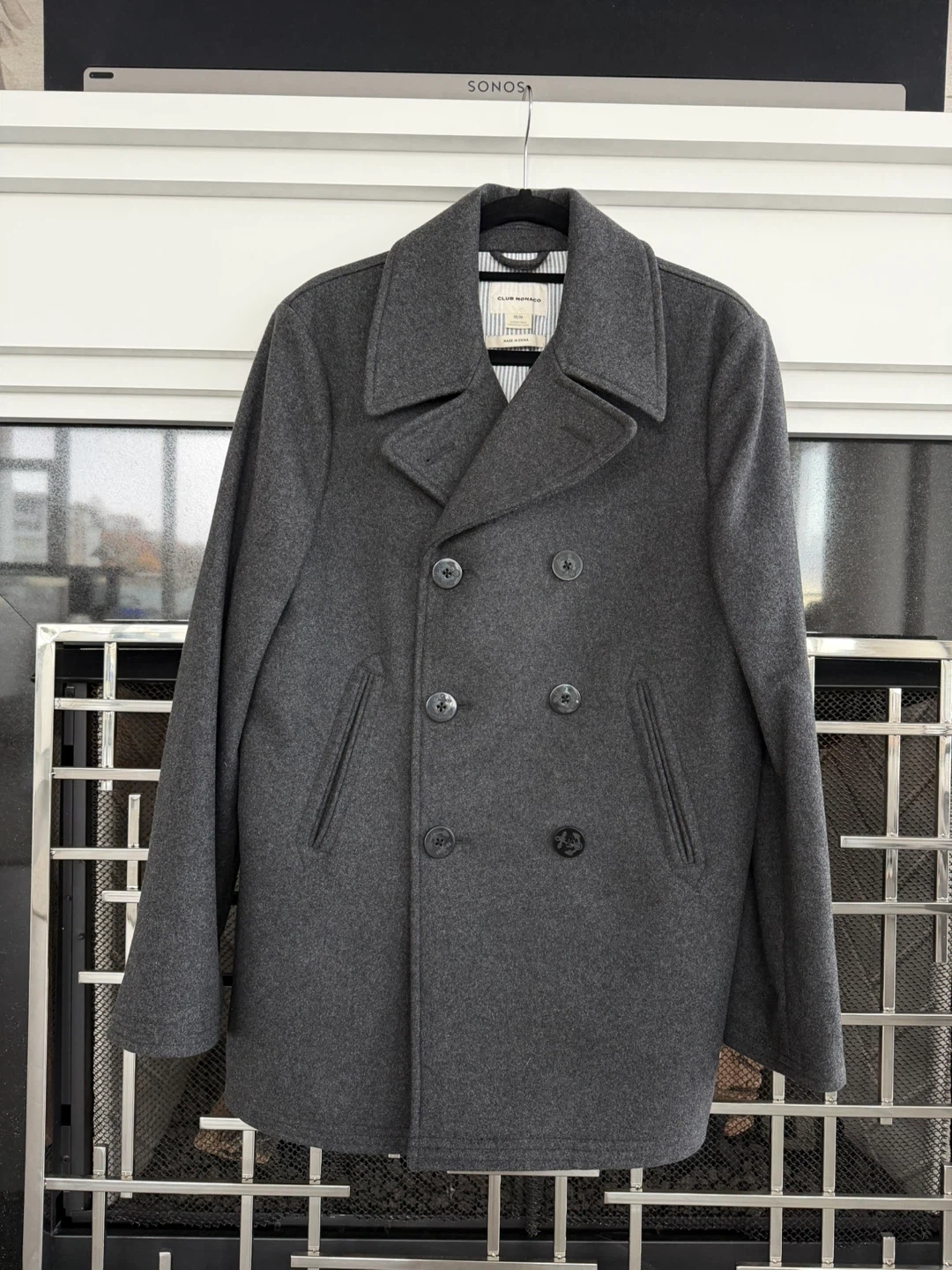 Selling a stylish Club Monaco pea coat in size M. It's made with a blend of 80% virgin wool and 20% polyamide for the shell, with body lining of 100% cotton and sleeve lining of 100% polyester. The coat features a classic double-breasted design and is in great condition!