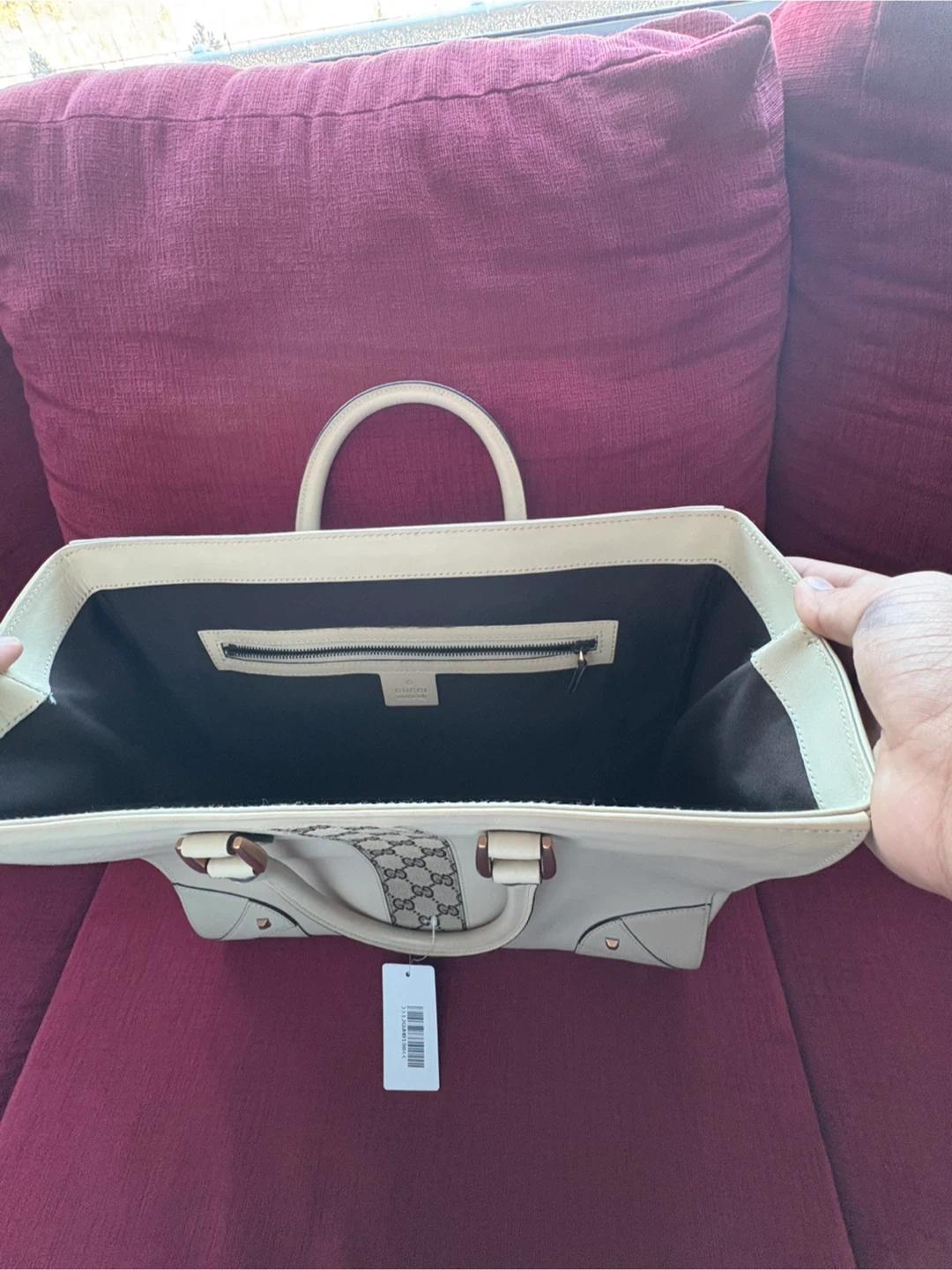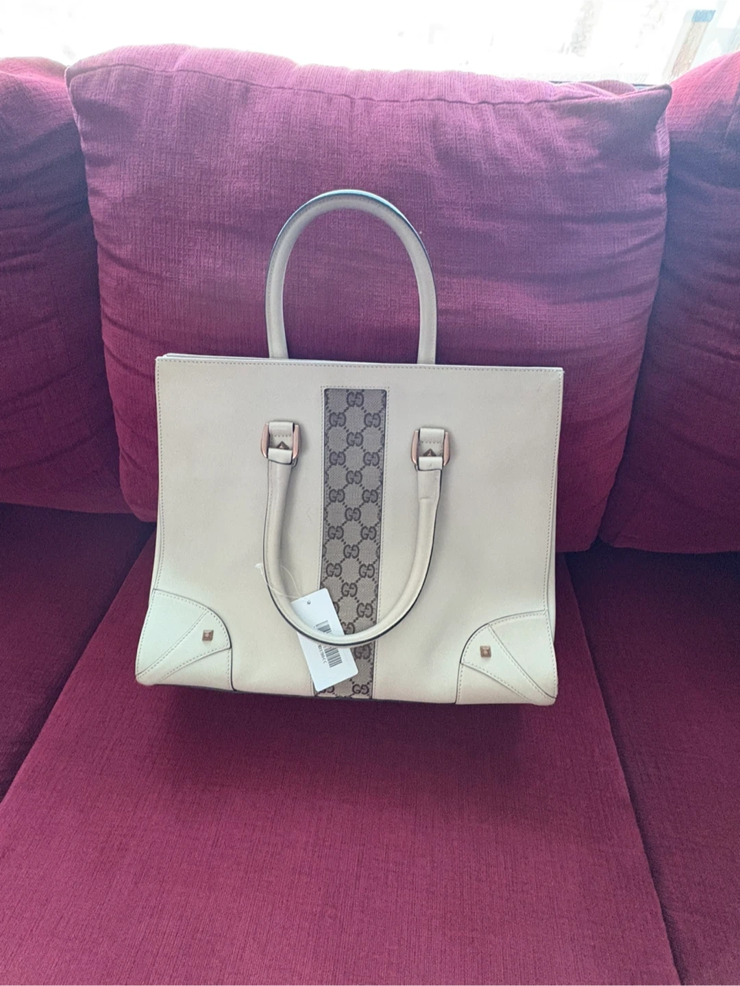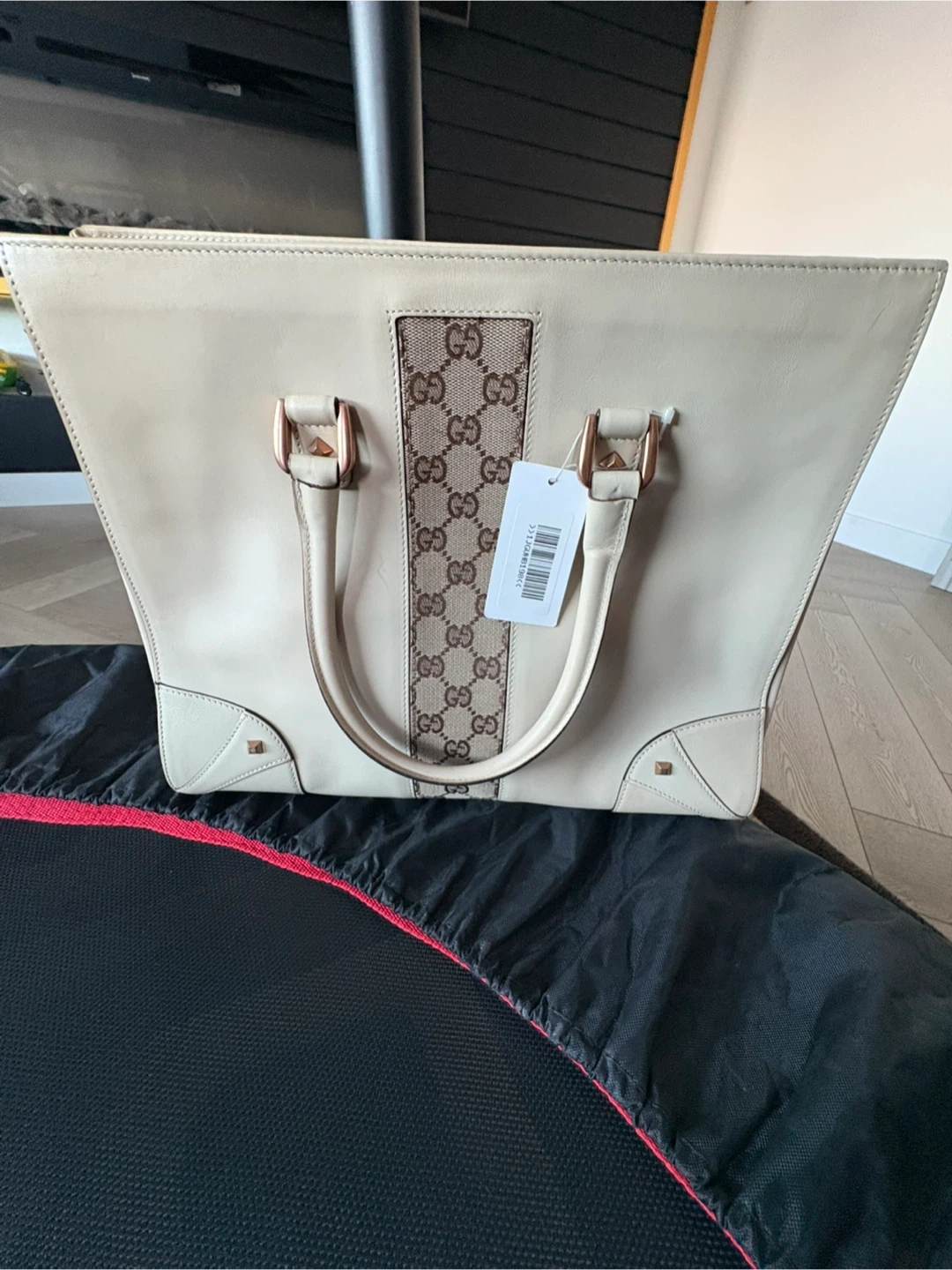 Selling a stylish Gucci tote bag in a lovely beige colour. It's in great condition and perfect for everyday use. The bag features the classic Gucci pattern and has a spacious interior.