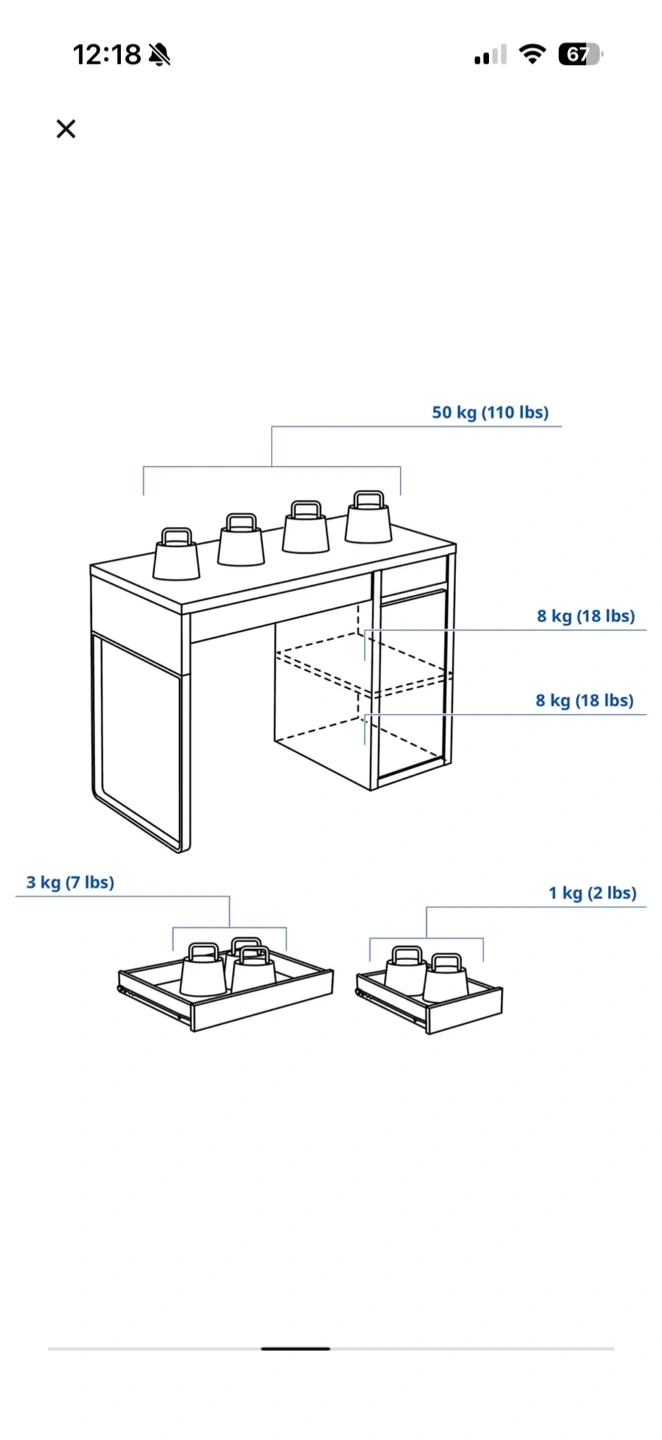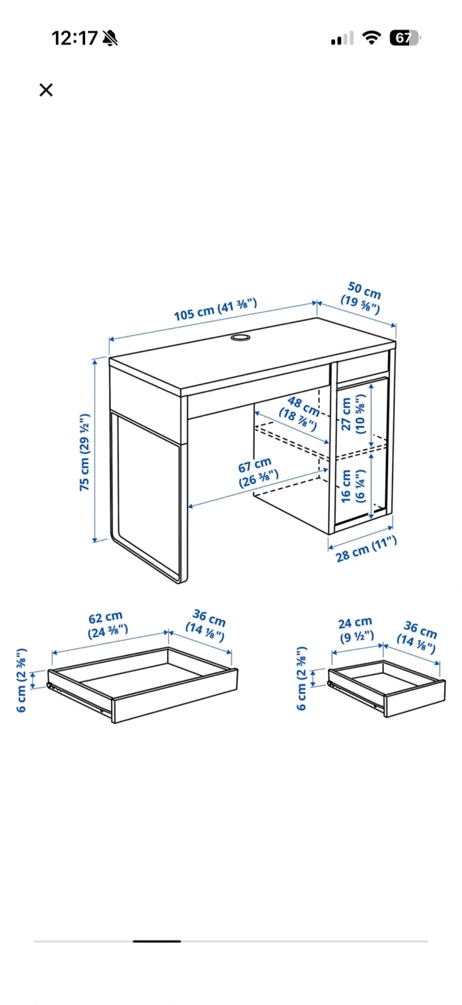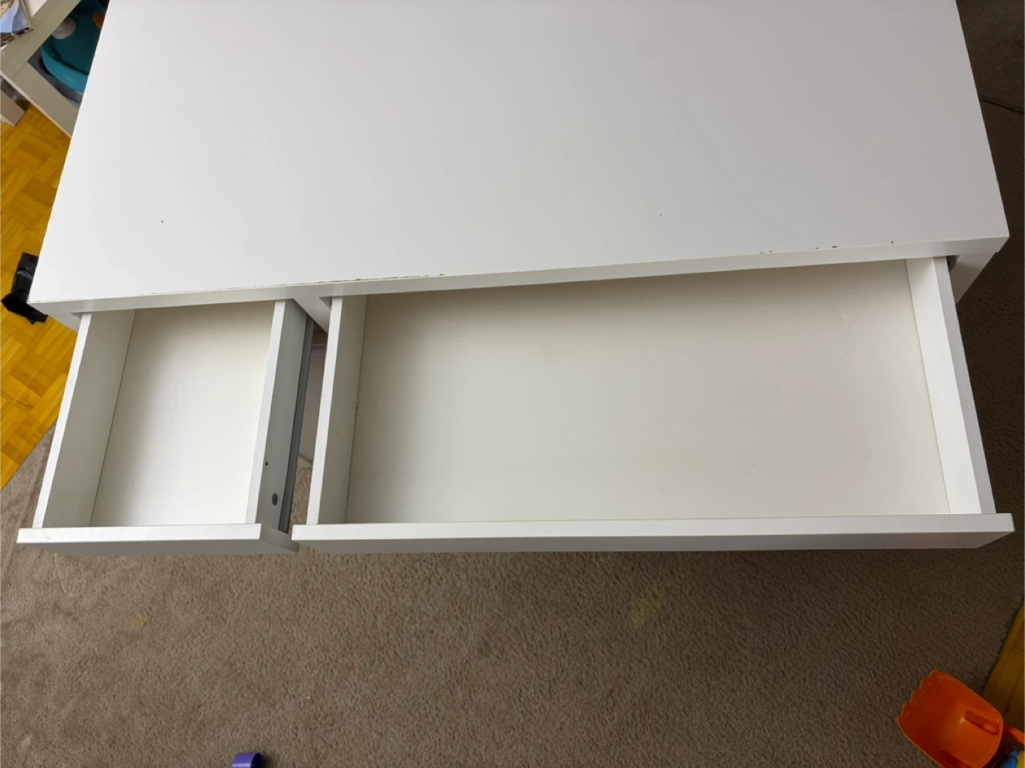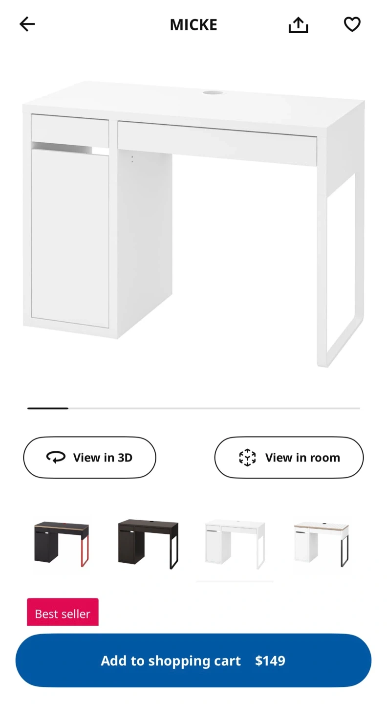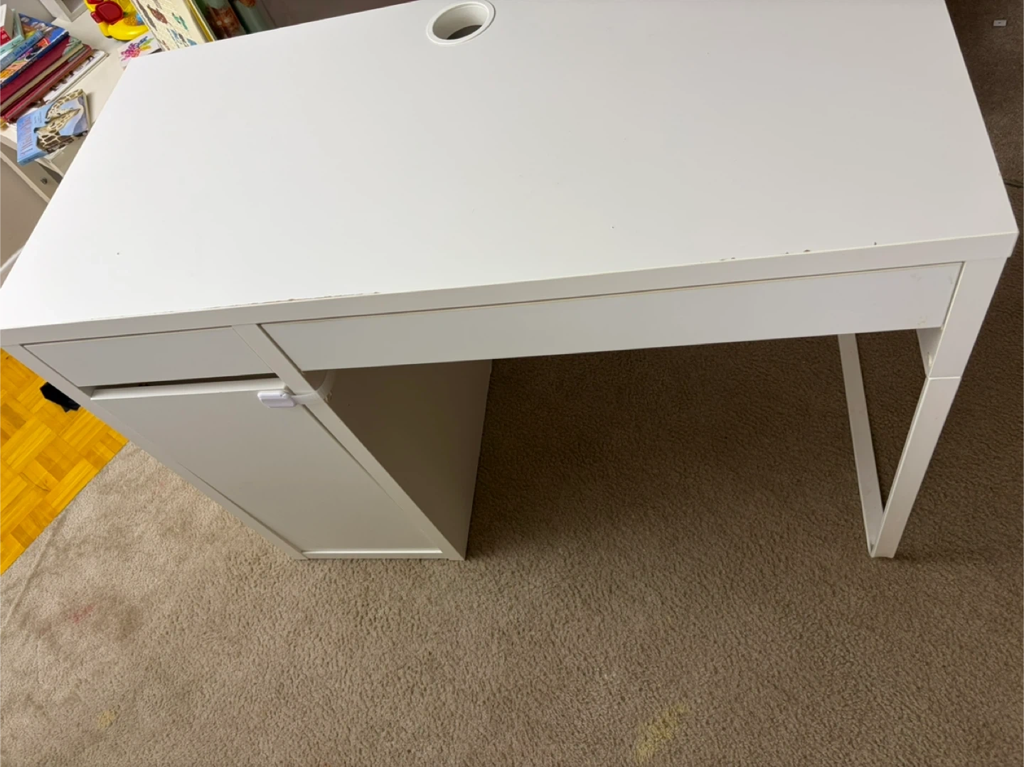 Selling a white IKEA MICKE desk! It's in good condition and has a clean, simple design that fits well in any room. It features a drawer and a cabinet for storage. Retails for $149.