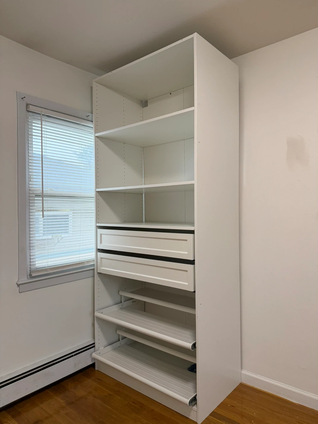 Selling an IKEA PAX wardrobe closet system in white. It features several shelves, two drawers, and shoe racks, providing ample storage space. It's a great solution for organizing your clothes and shoes!