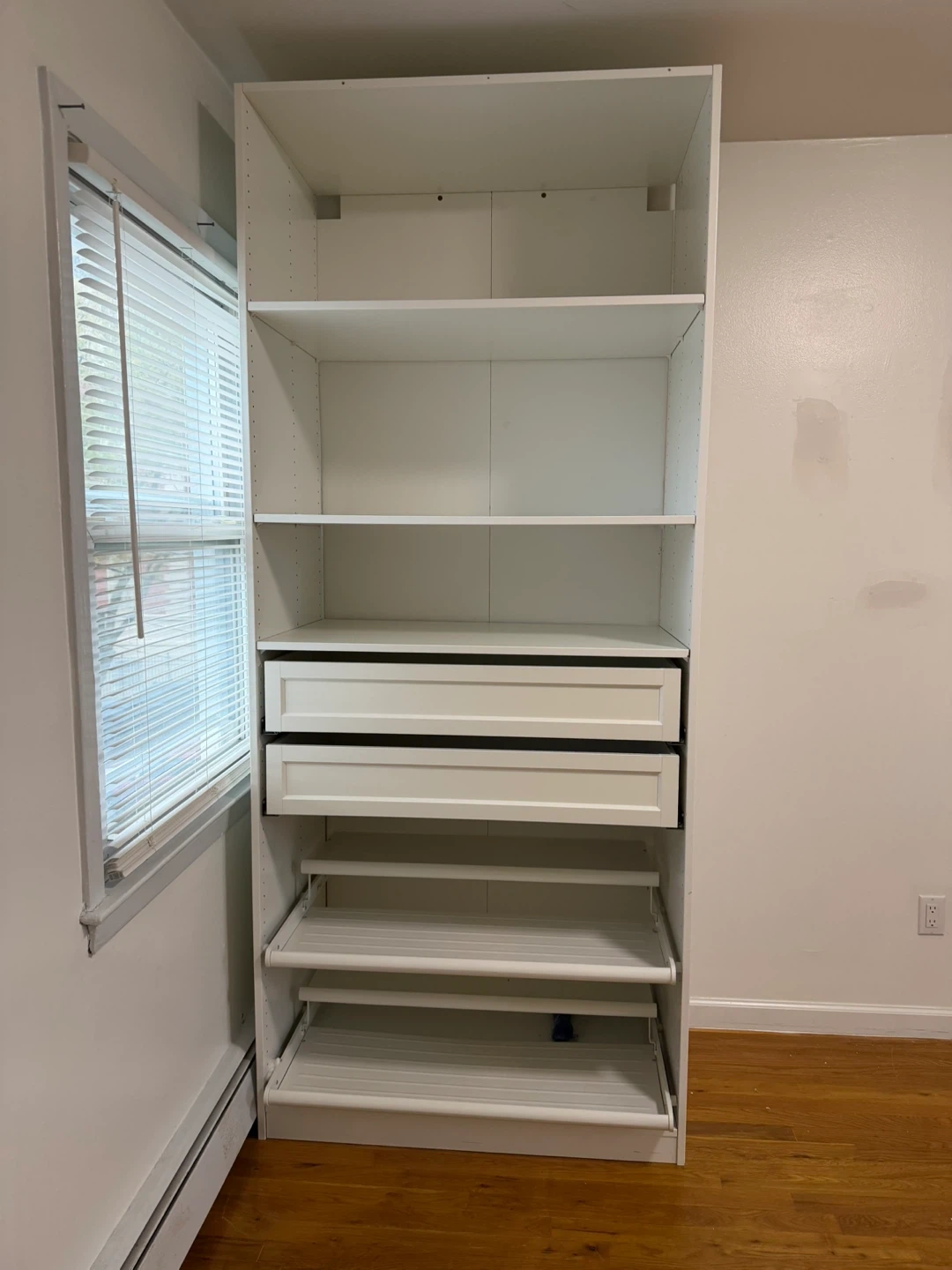 Selling an IKEA PAX wardrobe closet system in white. It features several shelves, two drawers, and shoe racks, providing ample storage space. It's a great solution for organizing your clothes and shoes!