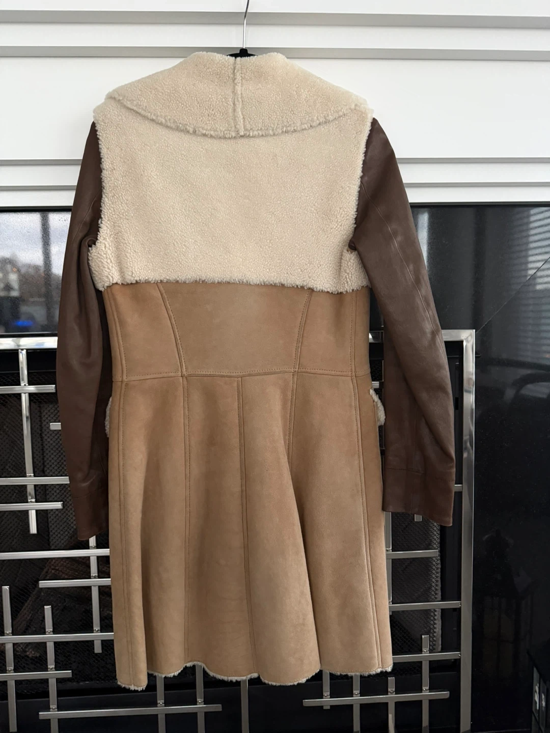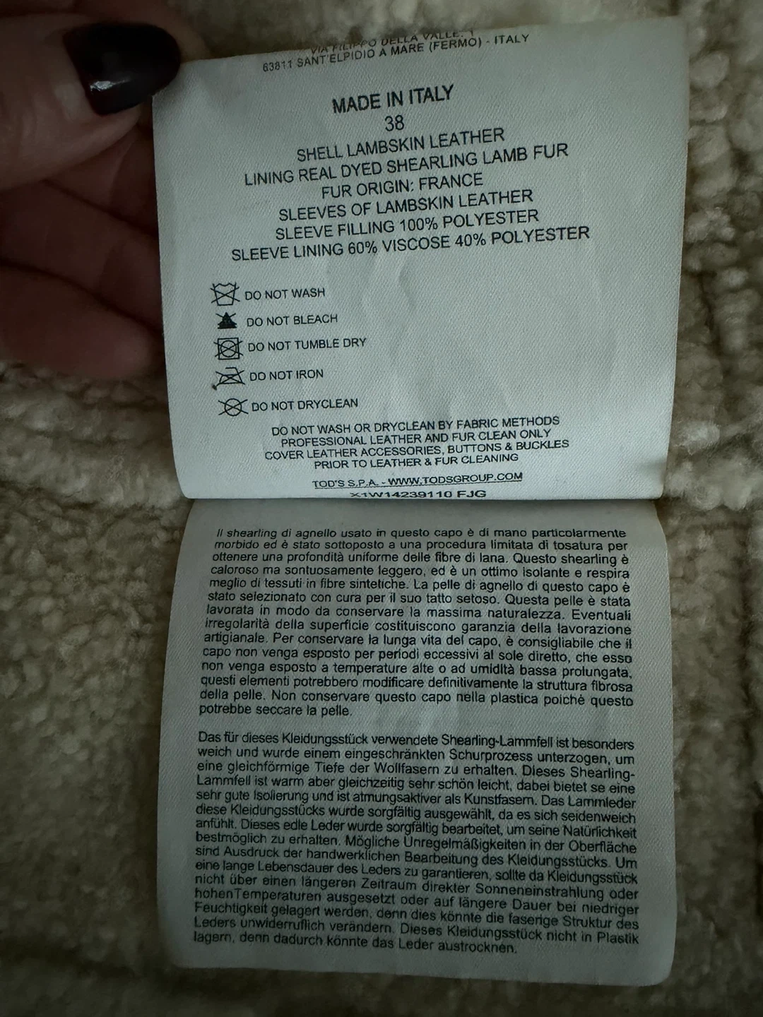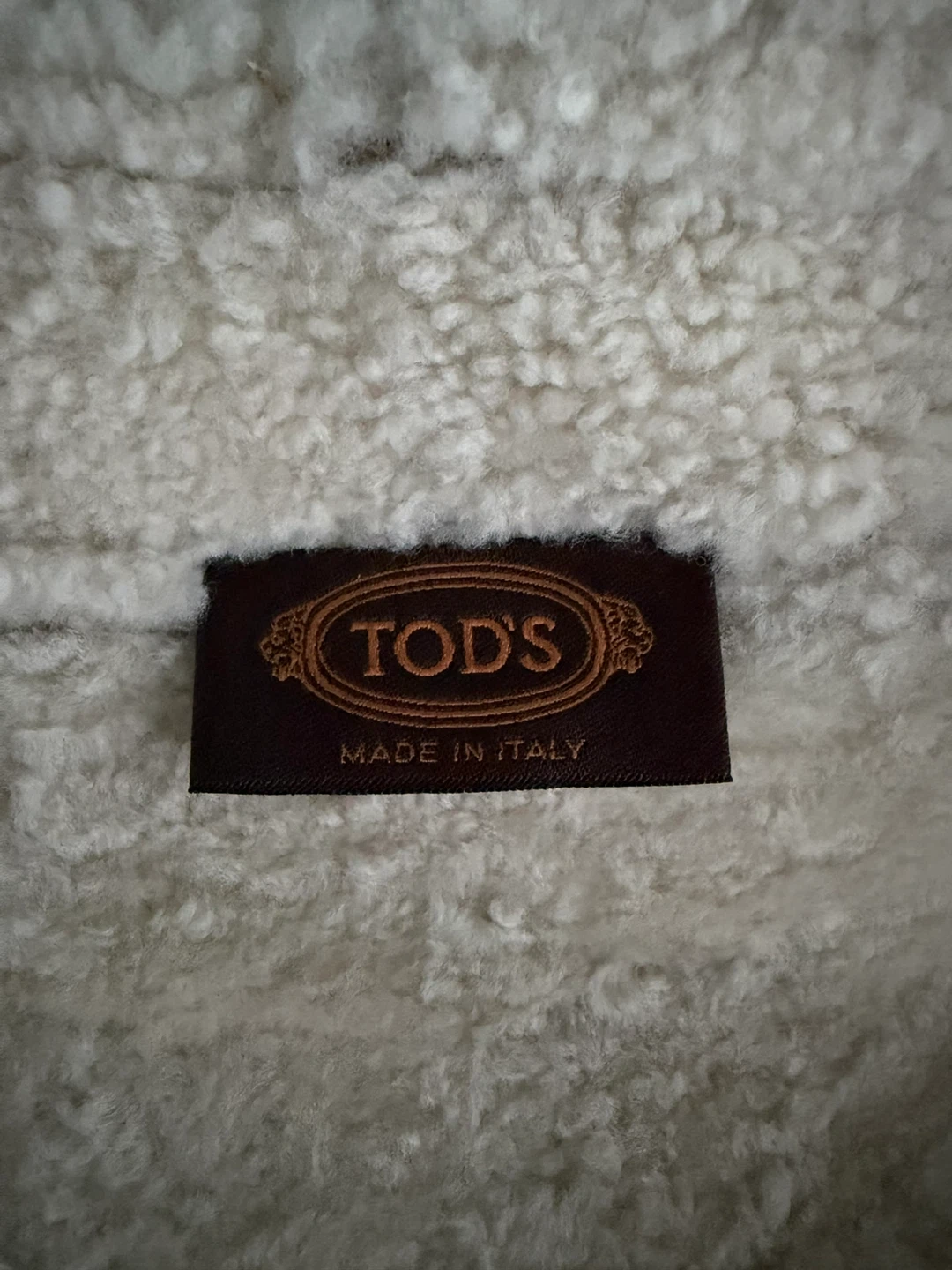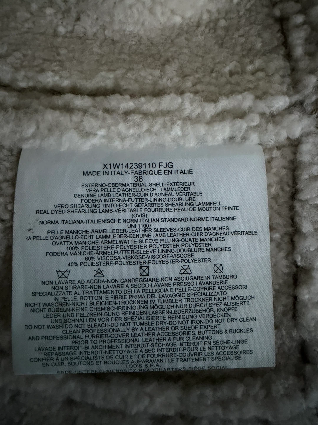 TOD'S Shearling Lambskin Leather Coat, size 38. The lining is real dyed shearling lamb fur, sleeves are lambskin leather, and the sleeve lining is 60% viscose and 40% polyester. This beautiful coat is in great condition and ready to keep you warm!