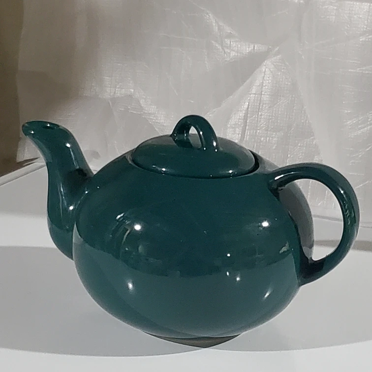Here's a lovely green ceramic teapot! It's in great shape and ready for a new home to brew some delicious tea. It has a classic design with a rounded body, a sturdy handle, and a well-fitted lid. Perfect for tea lovers!