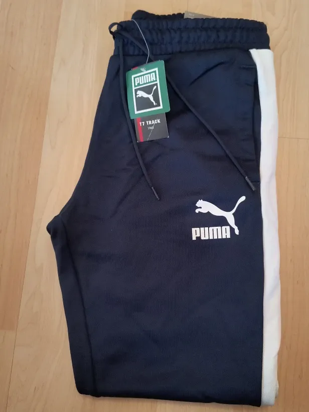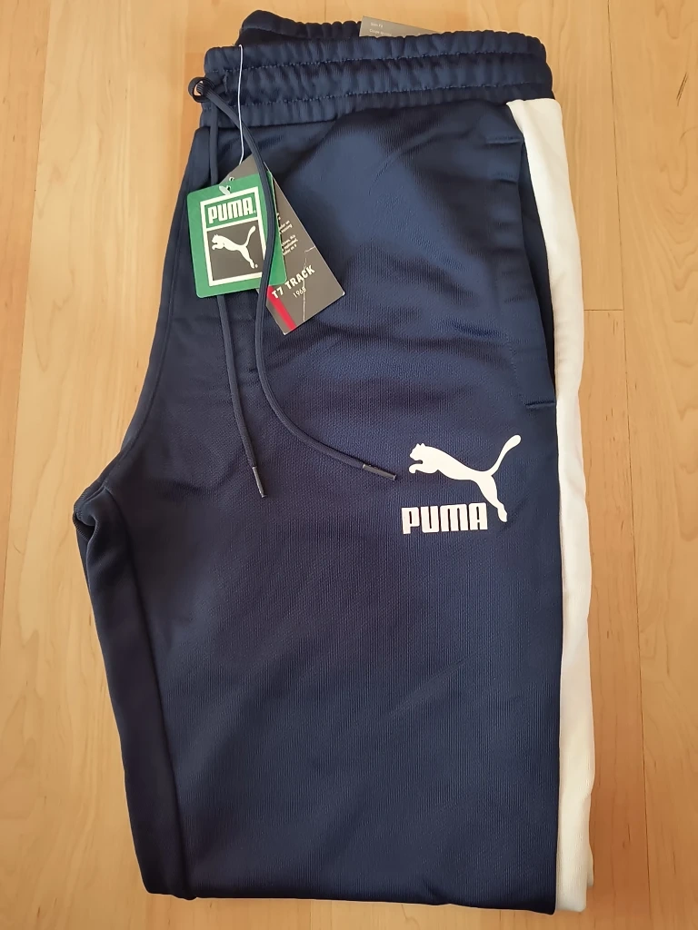 Brand new Puma T7 track pants in a stylish navy blue colour! These pants feature the classic Puma logo and a white stripe down the side. Perfect for casual wear or workouts