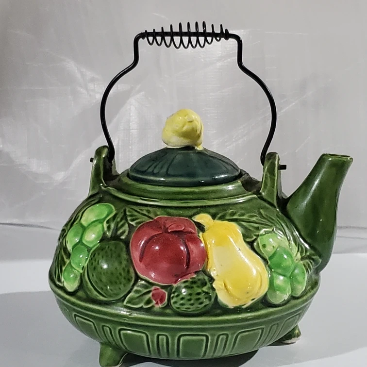 Selling a National Silver Company a vintage green ceramic teapot with a cute embossed fruit design. It's in great shape and would be a lovely addition to any kitchen or collection. The teapot features a black metal handle and a charming embossed fruit pattern around the body. Used for decoration
