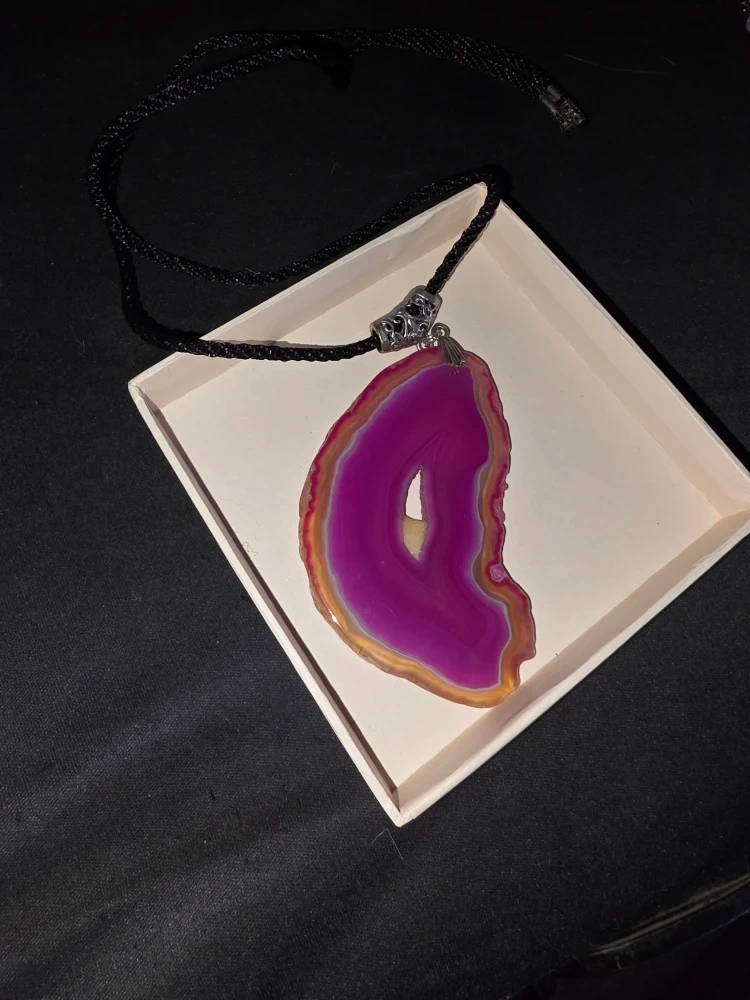 This is a unique agate slice pendant necklace. The pendant features a vibrant purple agate slice with a natural edge and a hole in the centre. It hangs from a black cord necklace. It's in great condition and comes in a box!