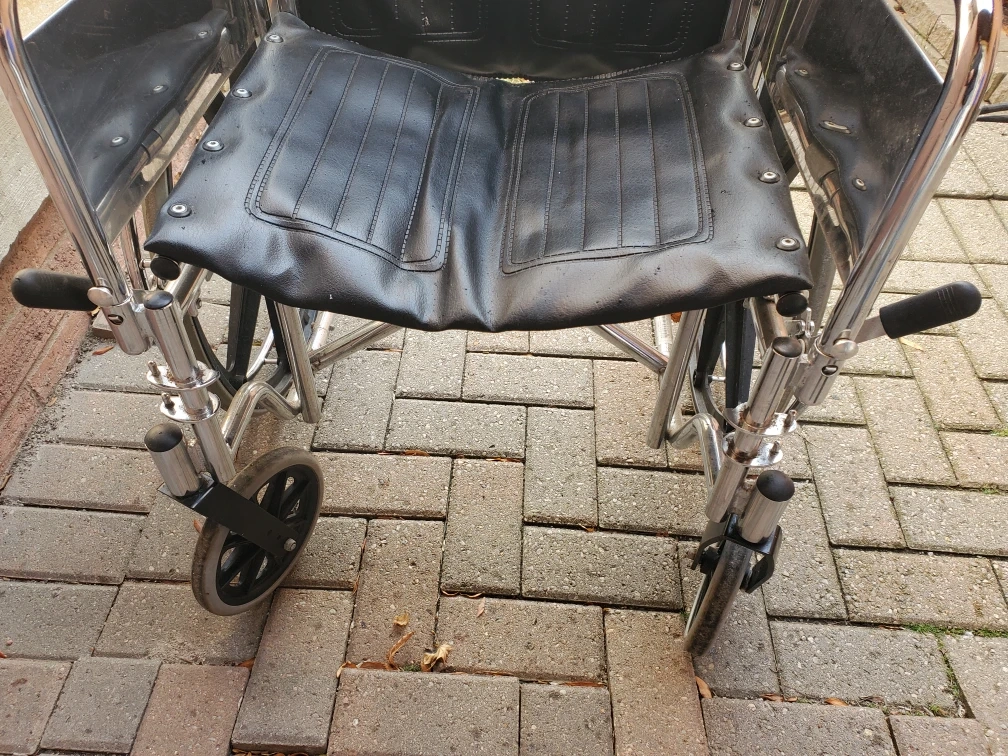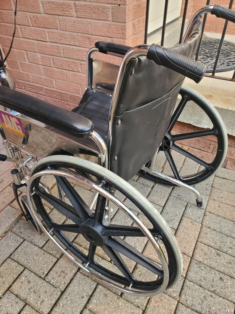 Selling a used AMG wheelchair. It features a black vinyl seat and backrest, with a sturdy silver frame. Great for mobility assistance!