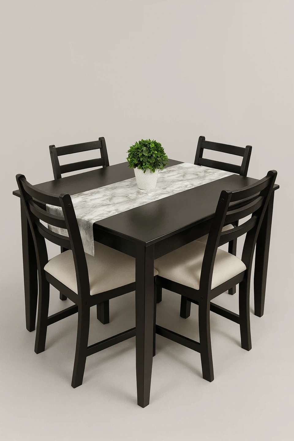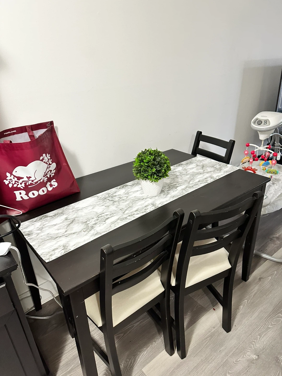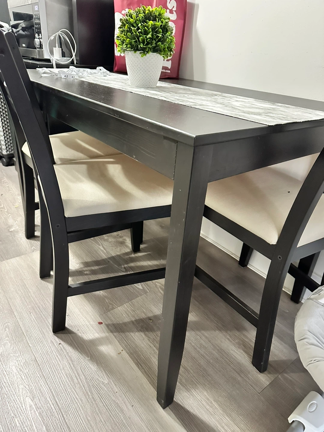 Selling a dining table with four chairs. It's in great condition and would be perfect for a small dining area or kitchen. The table is black, and the chairs have neutral-coloured seats. Ready for a new home!