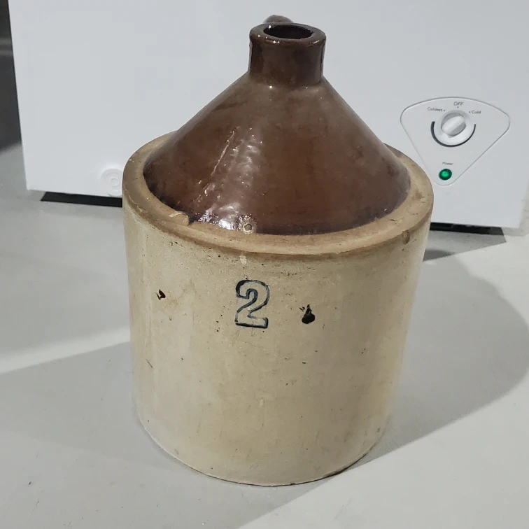 Selling a vintage stoneware jug, perfect for adding a rustic touch to your home decor! It's a 2-gallon jug in a classic brown and beige colour scheme.