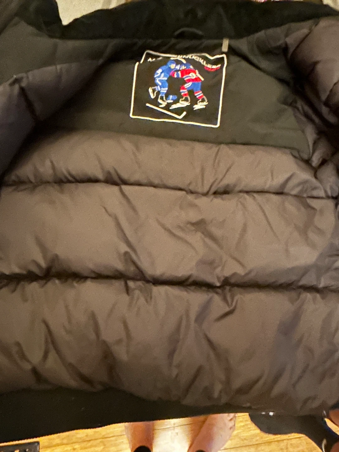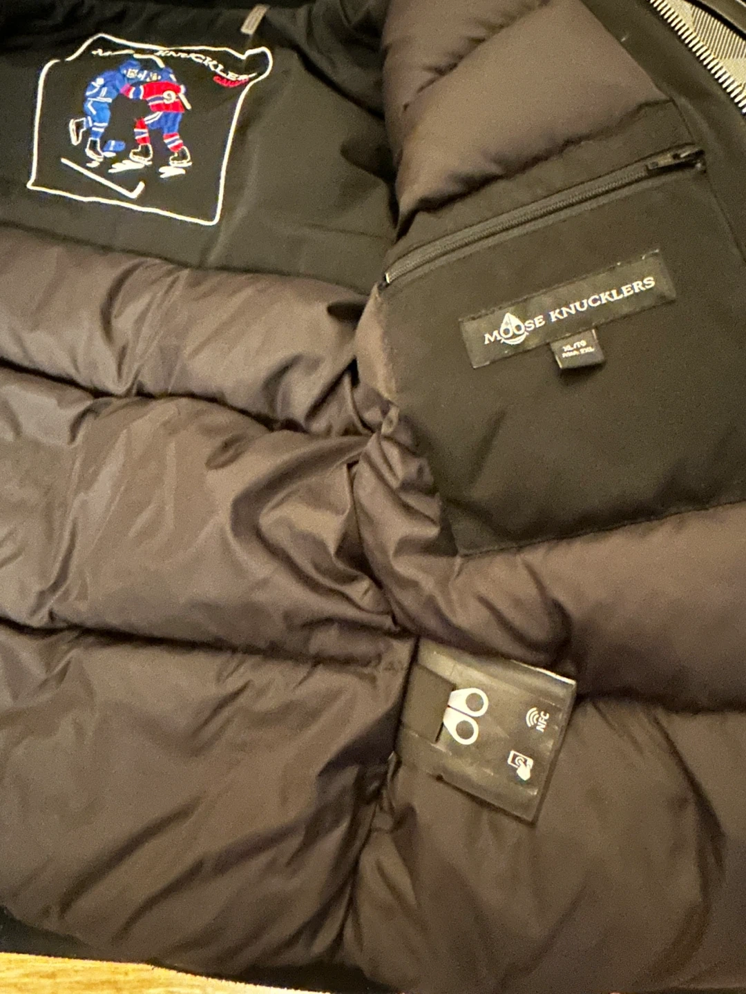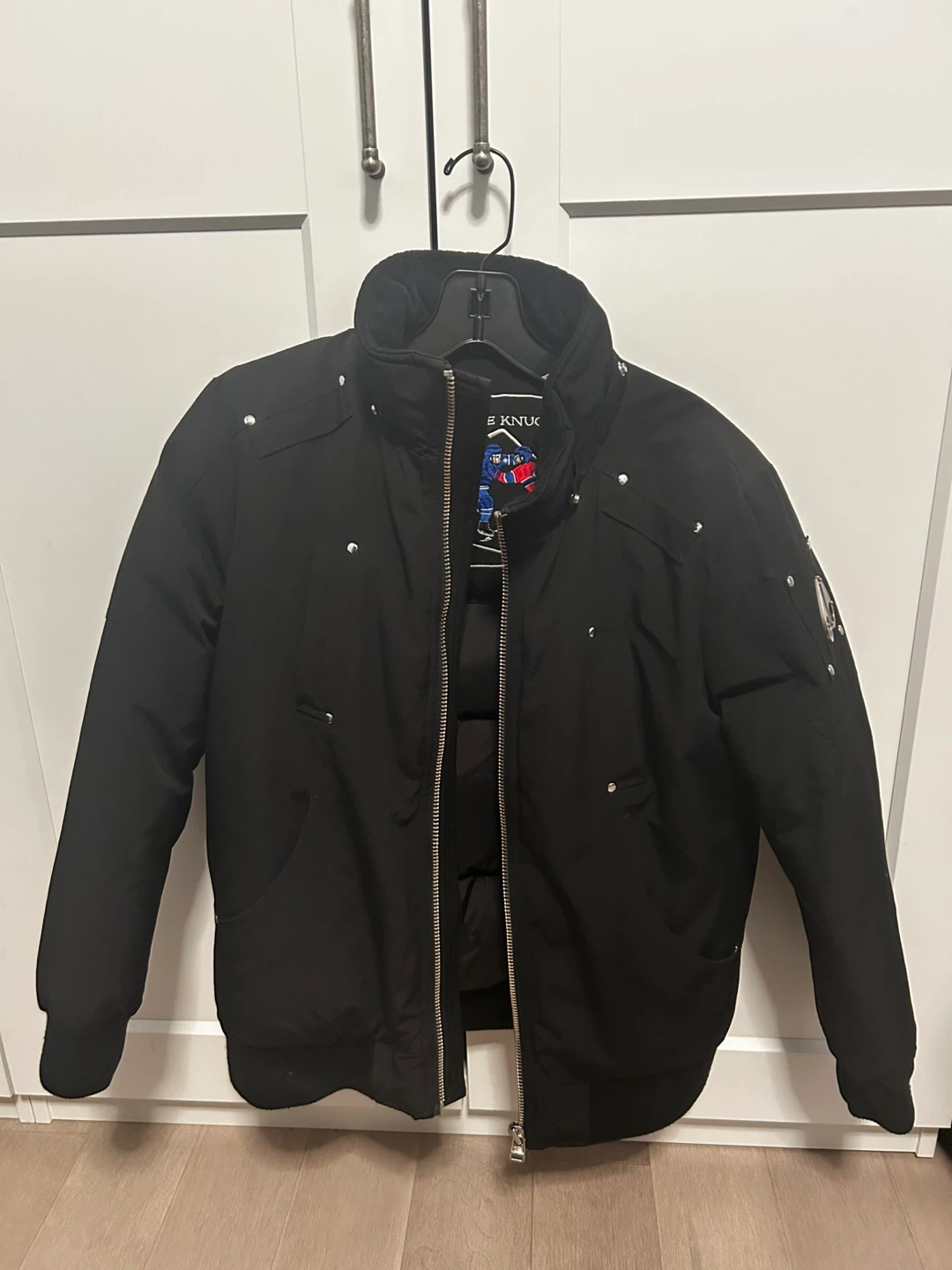 Selling a like new Moose Knuckles bomber jacket in size youth XL. Black Worn a few times, It's a stylish and warm jacket perfect for the Canadian winter. Down filled. The jacket features the iconic Moose Knuckles logo on the sleeve and a unique hockey player patch on the inside. Removable hood with white fur. It's in perfect condition!