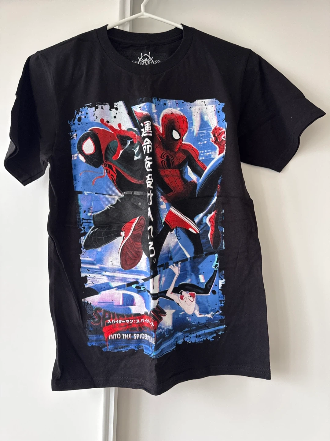 Selling a black T-shirt featuring a cool design from Spider-Man: Into the Spider-Verse! The shirt showcases Miles Morales, Spider-Man, and Spider-Gwen in a vibrant, eye-catching graphic. Perfect for any Spider-Man fan!