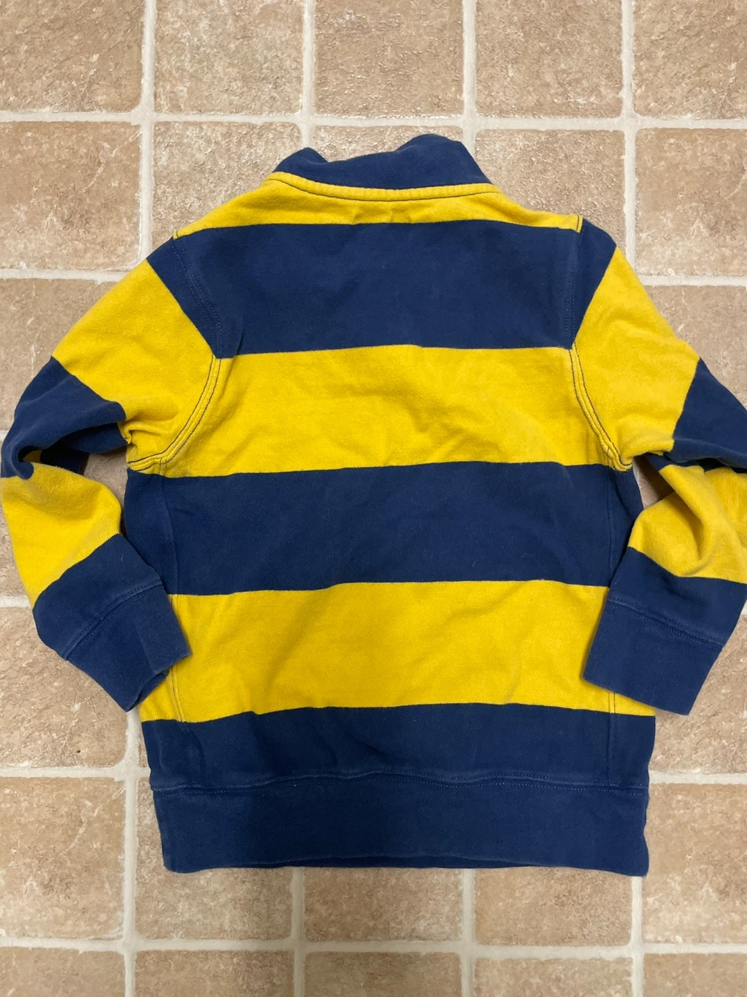 This is a cute Gap Kids pullover in size 2T. It features a classic striped design in yellow and blue. The pullover has a quarter-zip closure and is in good condition. Perfect for keeping your little one warm and stylish!